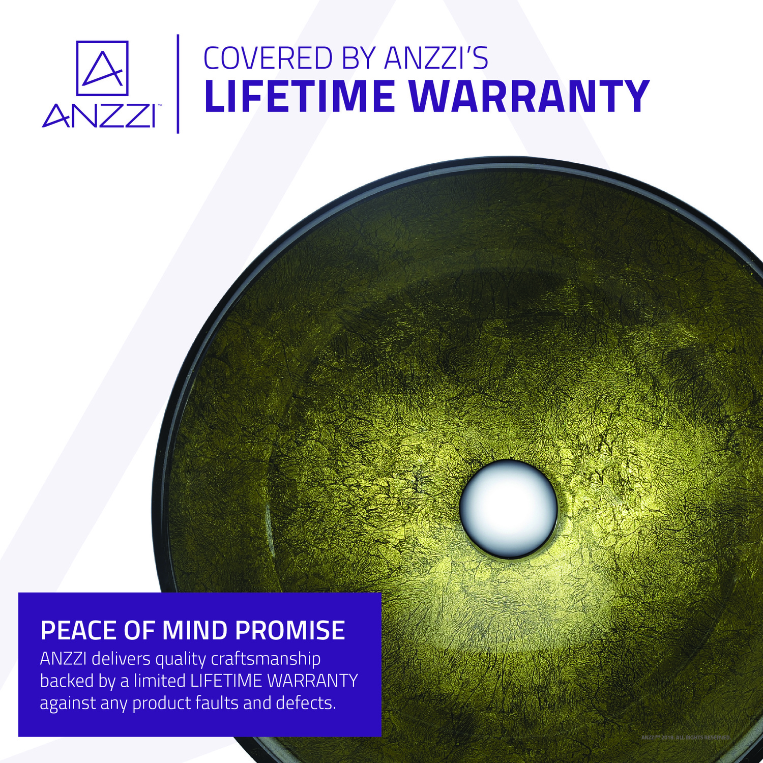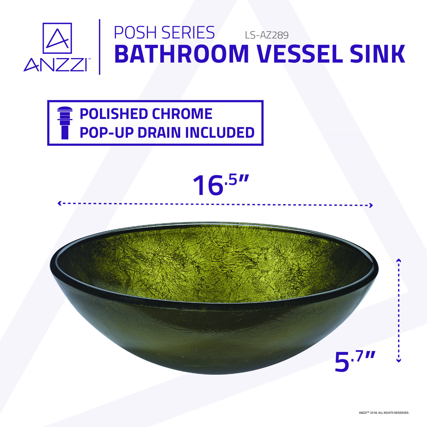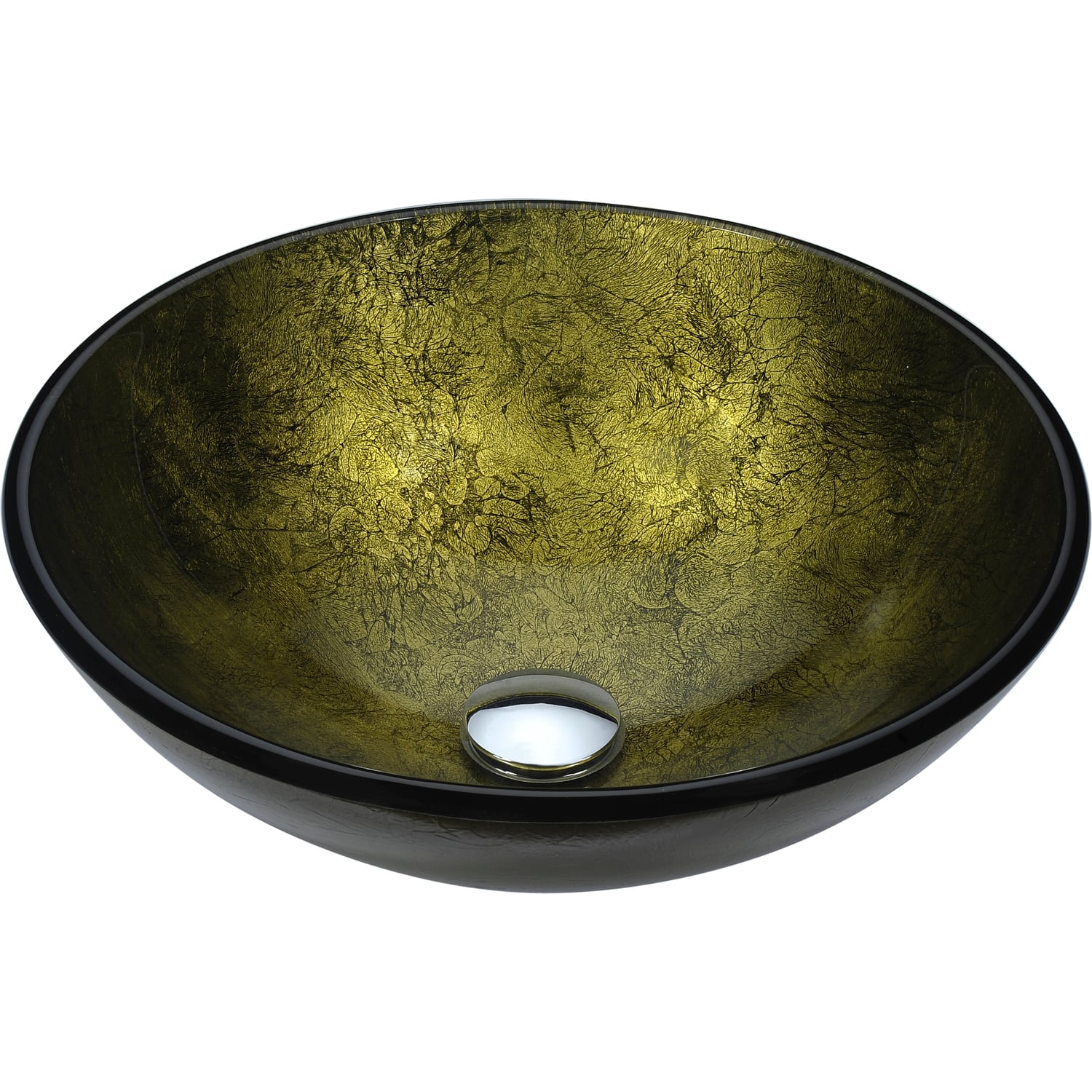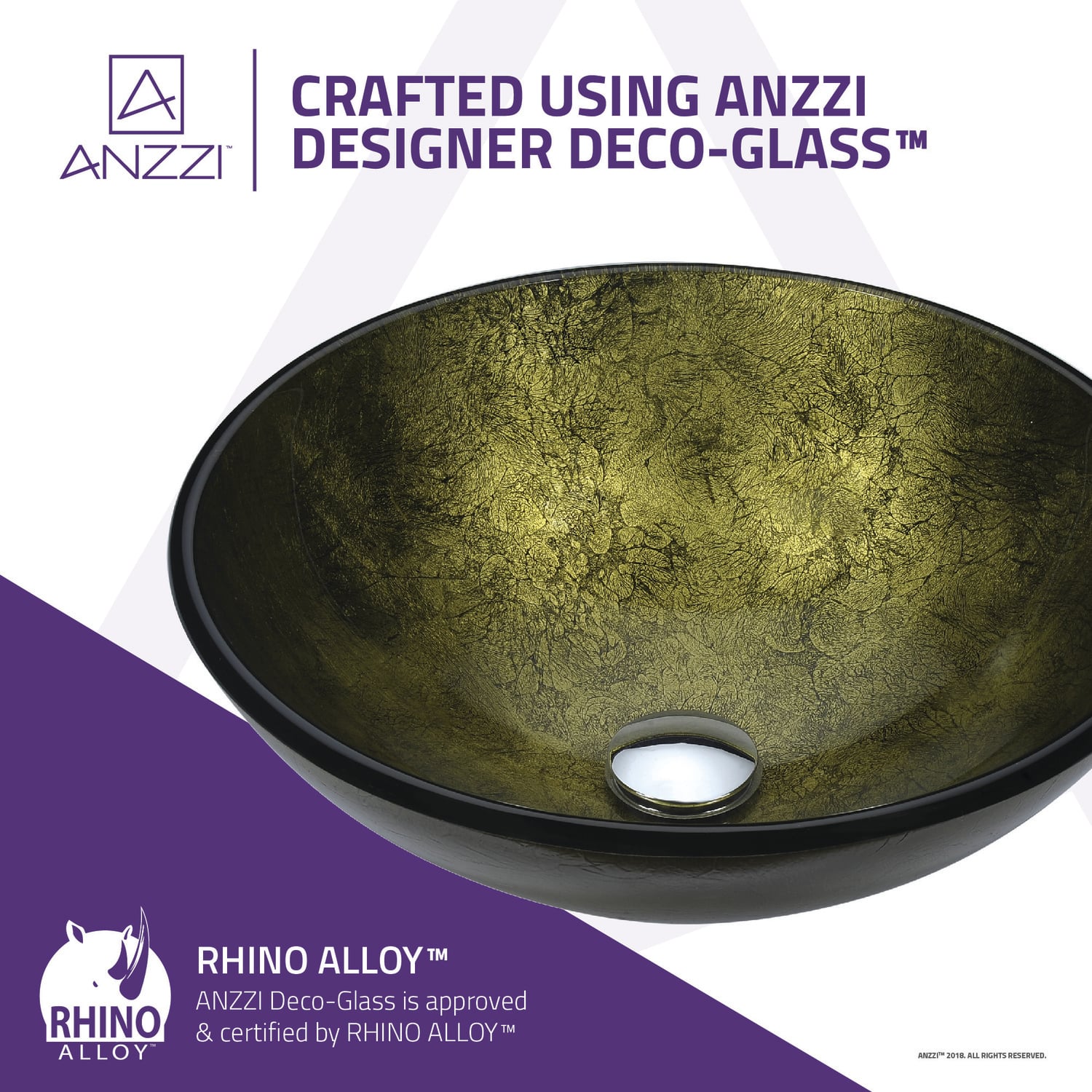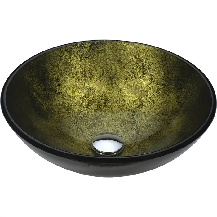 The ANZZI Posh Series sink is a traditionally crafted round vessel sink adorned in a Verdure Gold finish. Each ANZZI vessel sink is formed using RHINO ALLOY certified high tempered Deco-Glass material. The result is an elegantly shaped and captivating vessel centerpiece for any bathroom counter.RHINO ALLOY certified tempered deco-glass construction in a stunning Verdure Gold finishScratch-tough and stain-resistant non-porous surfaceEasy-to-clean low maintenanceTop mount installationDimensions: 16.5 in. L x 16.5 in. W x 5.7 in. HDeco-glass thickness: 1/2 in.Single 1.75 in. standard drain openingANZZI polished chrome pop-up drain includedShips from factory within 24 hours once order is processedLifetime WarrantyTo speak to a knowledgeable and dedicated ANZZI specialist simply call 1-844-44-ANZZI or visit us on the web at www.ANZZI.com