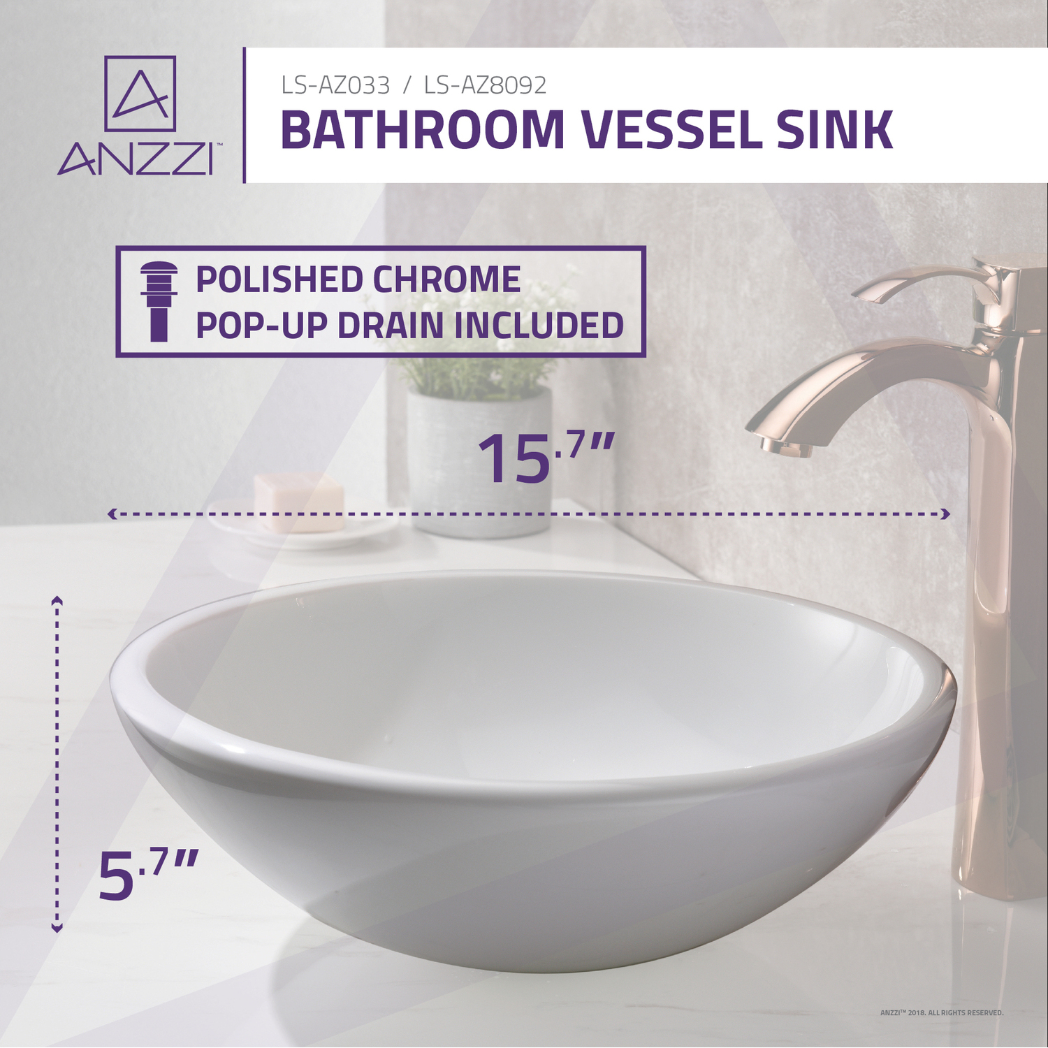 - ANZZI Polished Chrome pop-up drain included