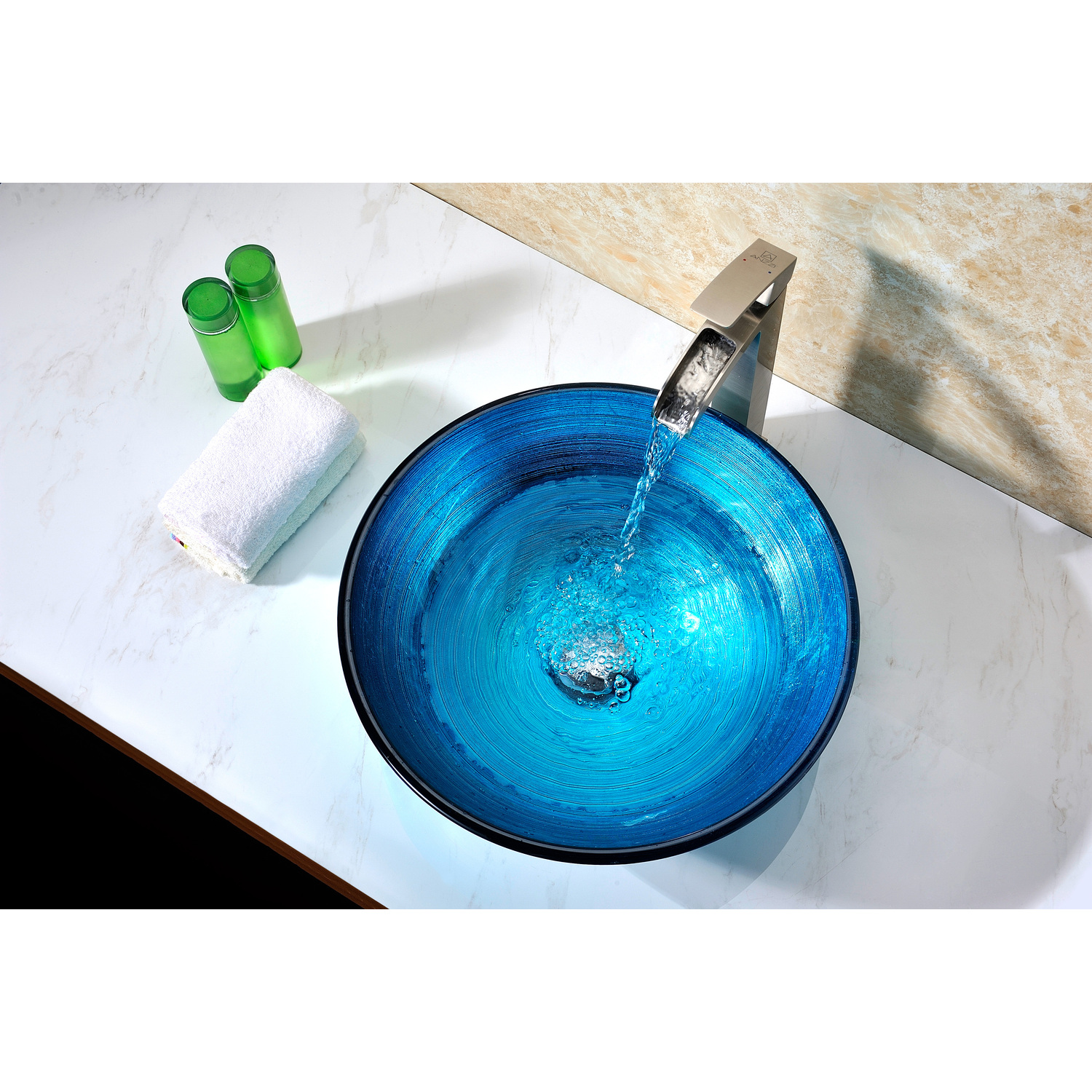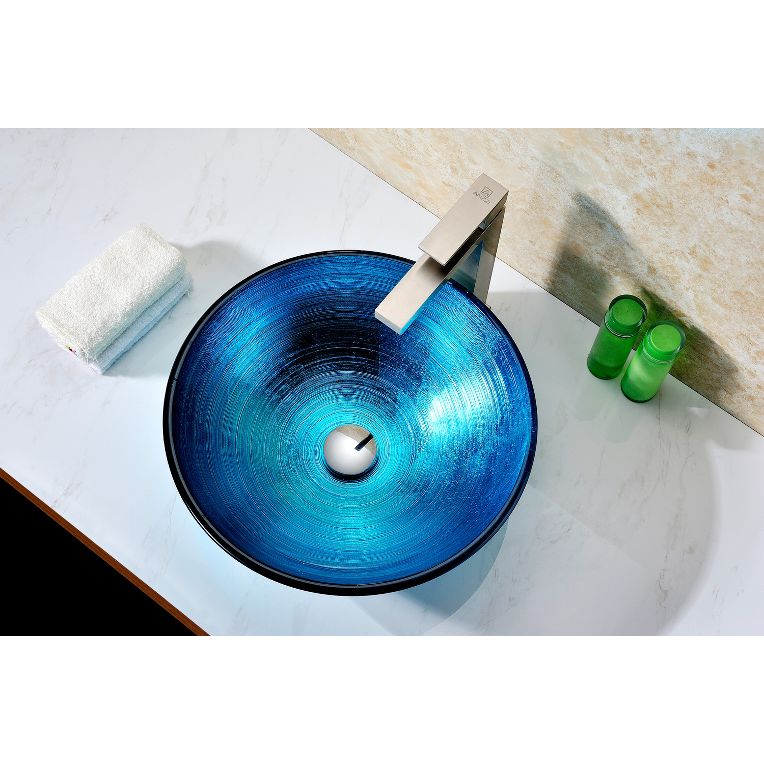 The ANZZI Taba Series sink is a traditionally crafted round vessel sink adorned in a Lustrous Blue Finish. Each ANZZI vessel sink is formed using RHINO ALLOY certified high tempered Deco-Glass material. The result is a dynamically shaped and captivating vessel centerpiece for any bathroom counter.Lustrous Blue FinishRHINO ALLOY certified Tempered Deco-Glass constructionScratch-tough and stain-resistant non-porous surfaceEasy-to-clean low maintenanceTop Mount installationDimensions: 16.5 in. L x 16.5 in. W x 5.75 in. HDeco-Glass thickness 1.75 in.Single 3/4 in. standard drain openingLimited Lifetime WarrantyTo speak to a knowledgeable and dedicated ANZZI specialist simply call 1-844-44-ANZZI or visit us on the web at www.ANZZI.comAdditionally, use the following codes to search for exquisite vessel faucet options from ANZZI: L-AZ022 , L-AZ095 , L-AZ095BN , L-AZ096 , L-AZ096BN , L-AZ097 , L-AZ097BN , L-AZ040 , L-AZ041