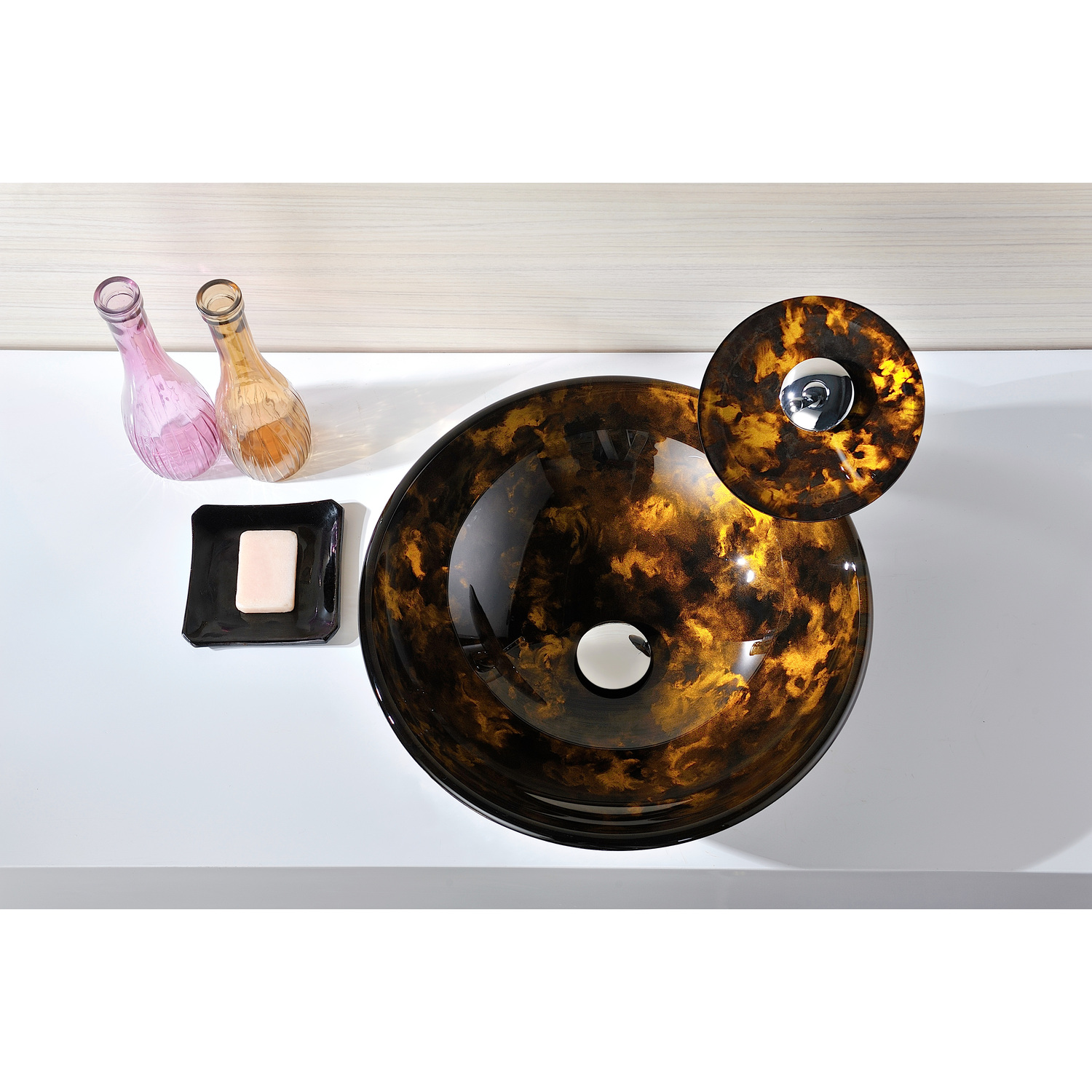 The ANZZI Toa Series sink is a traditionally crafted round vessel sink adorned in a Kindled Amber Finish. Each ANZZI vessel sink is formed using RHINO ALLOY certified high tempered Deco-Glass material. Additionally a matching Deco-Glass and chrome single handle waterfall faucet is bundled with vessel sink as a set. The result is a dynamically shaped and captivating vessel centerpiece for any bathroom counter.Kindled Amber FinishRHINO ALLOY certified Tempered Deco-Glass constructionScratch-tough and stain-resistant non-porous surfaceEasy-to-clean low maintenanceTop Mount installationDimensions: 16.5 in. L x 16.5 in. W x 5.75 in. HDeco-Glass thickness 1.75 in.Single handle matching Deco-Glass waterfall vessel faucet in chrome finish includedShips from factory within 24 hours once order is processedLifetime WarrantyTo speak to a knowledgeable and dedicated ANZZI specialist simply call 1-844-44-ANZZI or visit us on the web at www.ANZZI.comUse the following codes to search for additional vessel faucet options from ANZZI: L-AZ022 , L-AZ095 , L-AZ095BN , L-AZ096 , L-AZ096BN , L-AZ097 , L-AZ097BN , L-AZ040 , L-AZ041