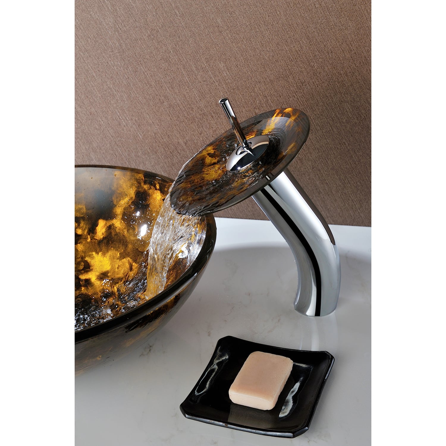 Anzzi Toa Series Deco-Glass Vessel Sink in Kindled Amber with Matching Chrome Waterfall Faucet, 191042047945, LS-AZ8102
