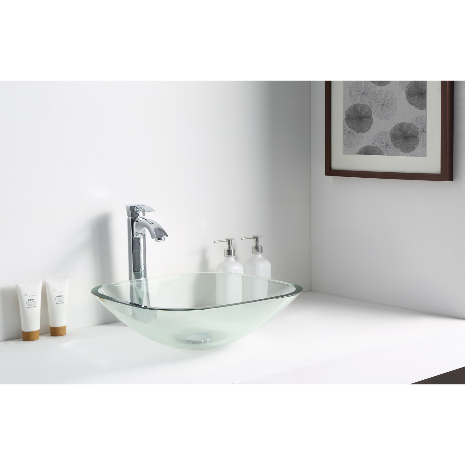 The ANZZI Story Series sink is a traditionally crafted squared vessel sink adorned in a Lustrous Clear Finish. Each ANZZI vessel sink is formed using RHINO ALLOY certified high tempered Deco-Glass material. The result is a perfectly shaped dynamically captivating vessel centerpiece for any luxury bathroom.Lustrous Clear FinishRHINO ALLOY certified Tempered Deco-Glass constructionScratch-tough and stain-resistant non-porous surfaceEasy-to-clean low maintenanceTop Mount installationDimensions: 16.5 in. L x 16.5 in. W x 5 in. HDeco-Glass thickness 1.75 in.Single 1.75 in. standard drain openingLimited Lifetime WarrantyTo speak to a knowledgeable and dedicated ANZZI specialist simply call 1-844-44-ANZZI or visit us on the web at www.ANZZI.comAdditionally, use the following codes to search for exquisite vessel faucet options from ANZZI: L-AZ022 , L-AZ095 , L-AZ095BN , L-AZ096 , L-AZ096BN , L-AZ097 , L-AZ097BN , L-AZ040 , L-AZ041
