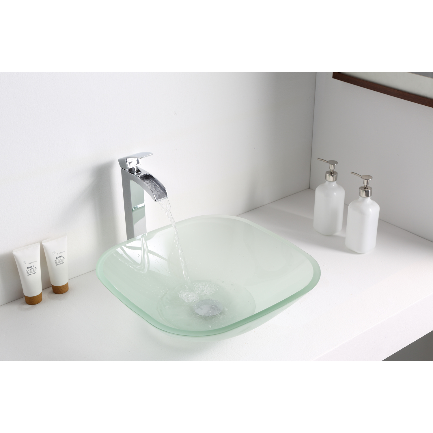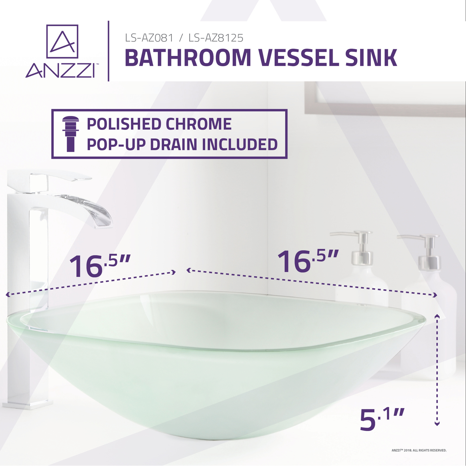 The ANZZI Victor Series sink is a traditionally crafted squared vessel sink adorned in a Lustrous Frosted Finish. Each ANZZI vessel sink if formed using RHINO ALLOY certified high tempered Deco-Glass material. The result is a perfectly shaped dynamically captivating vessel centerpiece for any bathroom counter.Lustrous Frosted FinishRHINO ALLOY certified Tempered Deco-Glass constructionScratch-tough and stain-resistant non-porous surfaceEasy-to-clean low maintenanceTop Mount installationDimensions: 16.5 in. L x 16.5 in. W x 5.125 in. HDeco-Glass thickness 1/2 in.Single 3/4 in. standard drain openingANZZI pop-up drain includedShips from factory within 24 hours once order is processedLifetime WarrantyTo speak to a knowledgeable and dedicated ANZZI specialist simply call 1-844-44-ANZZI or visit us on the web at www.ANZZI.comAdditionally, use the following codes to search for exquisite vessel faucet options from ANZZI: L-AZ022 , L-AZ095 , L-AZ095BN , L-AZ096 , L-AZ096BN , L-AZ097 , L-AZ097BN , L-AZ040 , L-AZ041