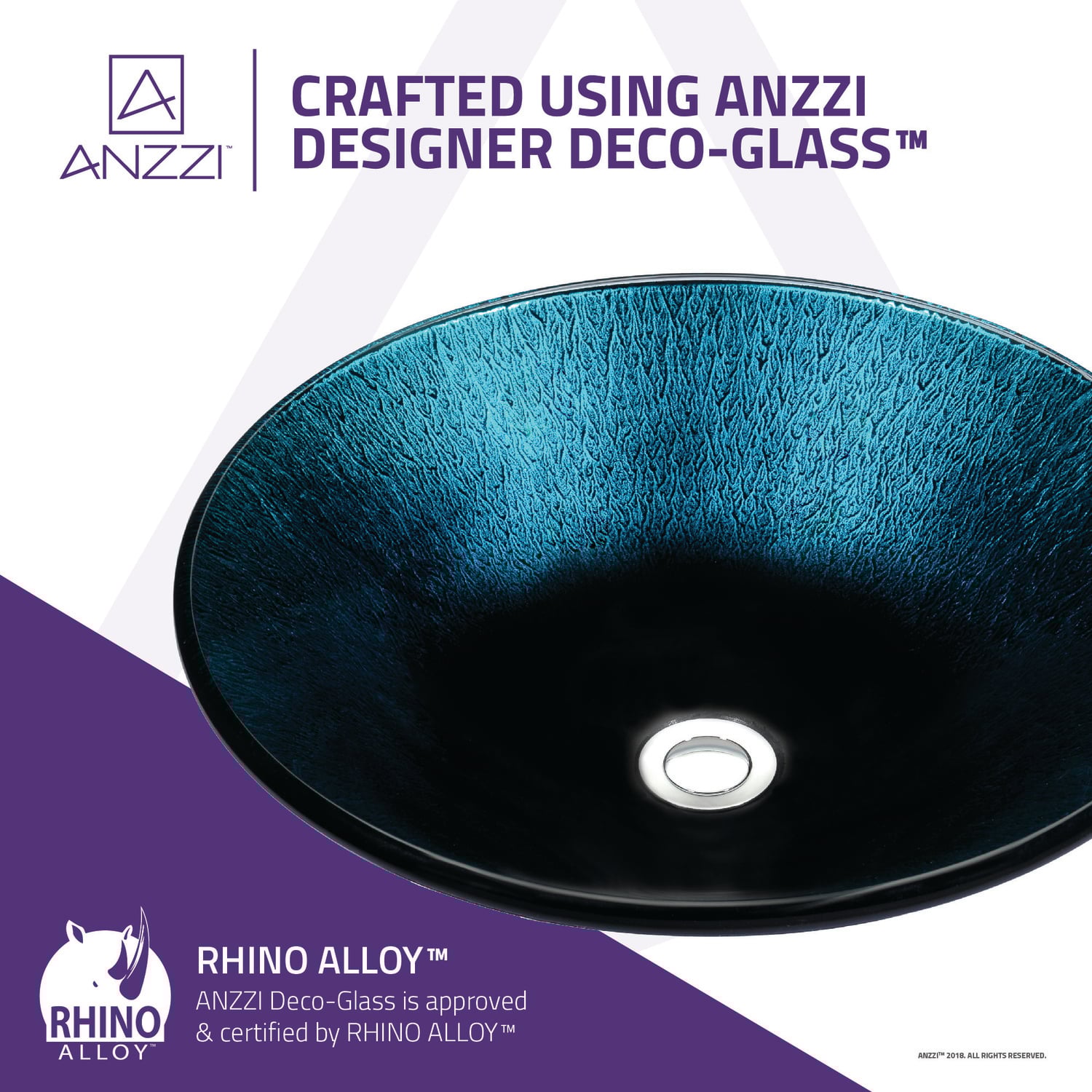 The ANZZI Tara Series sink is a traditionally crafted round vessel sink adorned in a Marine Crest finish. Each ANZZI vessel sink is formed using RHINO ALLOY certified high tempered Deco-Glass material. The result is an elegantly shaped and captivating vessel centerpiece for any bathroom counter.RHINO ALLOY certified tempered deco-glass constructionScratch-tough and stain-resistant non-porous surfaceEasy-to-clean low maintenanceTop mount installationDimensions: 17.7 in. L x 17.7 in. W x 5.7 in. HDeco-glass thickness: 1/2 in.Single 1.75 in. standard drain openingANZZI Polished Chrome pop-up drain includedShips from factory within 24 hours once order is processedLimited Lifetime WarrantyTo speak to a knowledgeable and dedicated ANZZI specialist simply call 1-844-44-ANZZI or visit us on the web at www.ANZZI.com