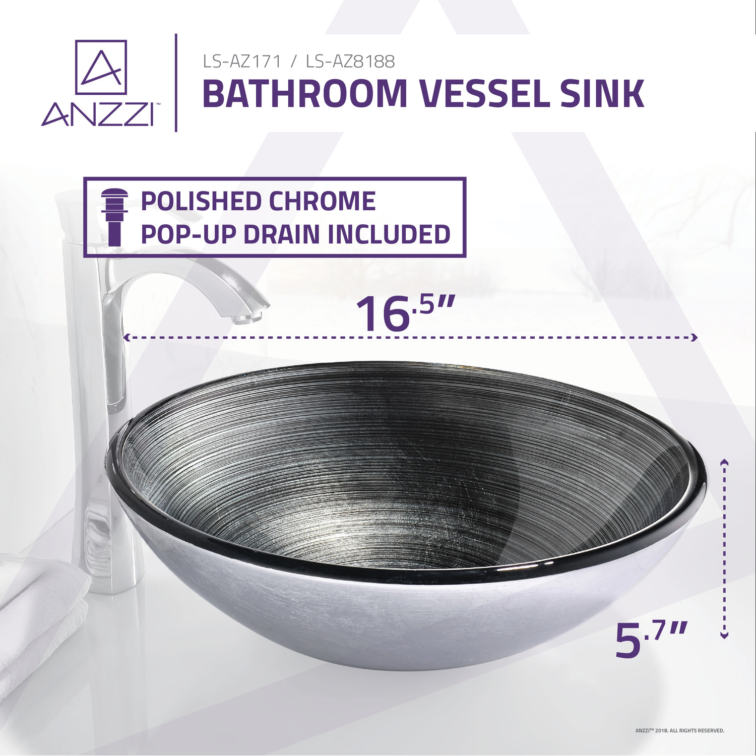 - ANZZI Polished Chrome pop-up drain included
