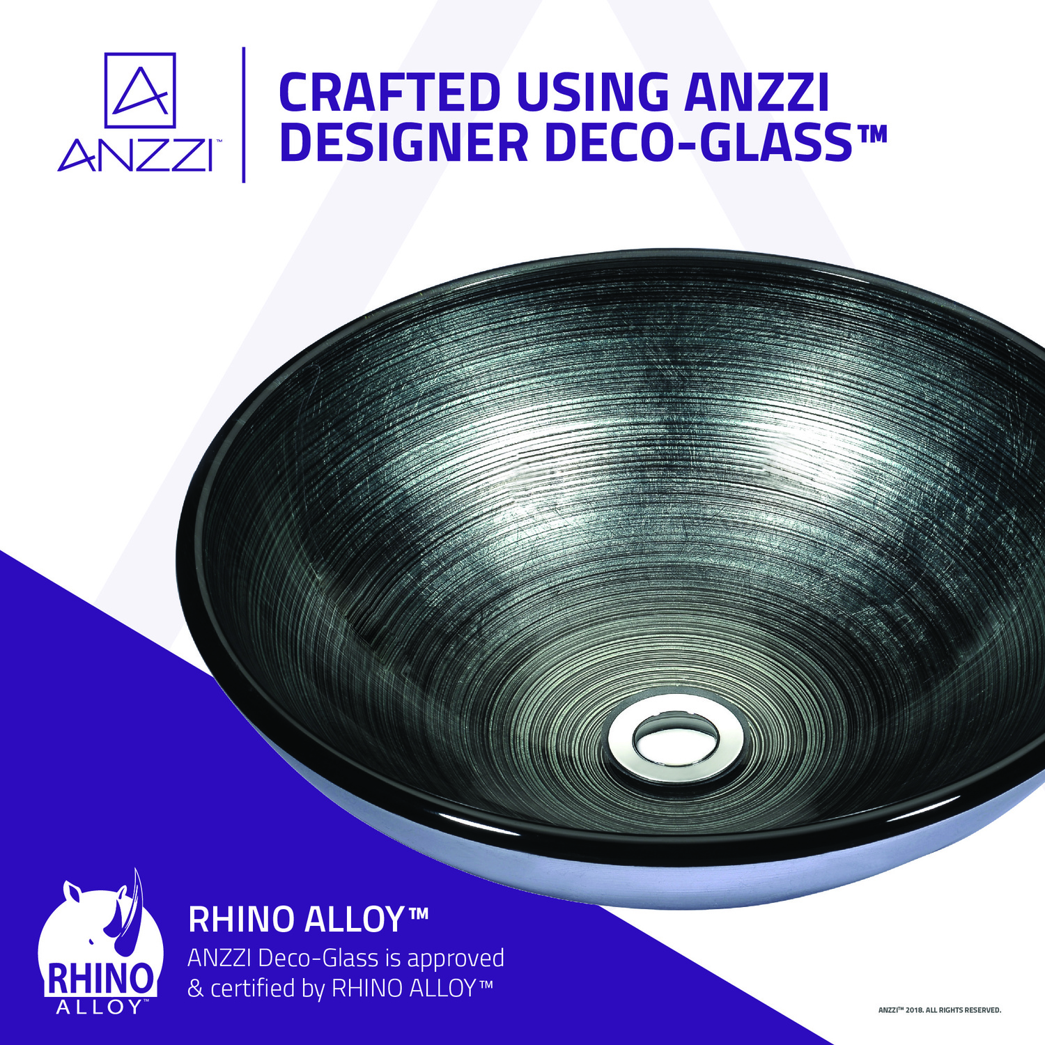 The ANZZI Tara Series sink is a traditionally crafted round vessel sink adorned in a Precious Storm finish. Each ANZZI vessel sink is formed using RHINO ALLOY certified high tempered Deco-Glass material. The result is an elegantly shaped and captivating vessel centerpiece for any bathroom counter.RHINO ALLOY certified tempered deco-glass constructionScratch-tough and stain-resistant non-porous surfaceEasy-to-clean low maintenanceTop mount installationDimensions: 16.5 in. L x 16.5 in. W x 5.7 in. HDeco-glass thickness: 1/2 in.Single 1.75 in. standard drain openingANZZI Polished Chrome pop-up drain includedShips from factory within 24 hours once order is processedLimited Lifetime WarrantyTo speak to a knowledgeable and dedicated ANZZI specialist simply call 1-844-44-ANZZI or visit us on the web at www.ANZZI.com