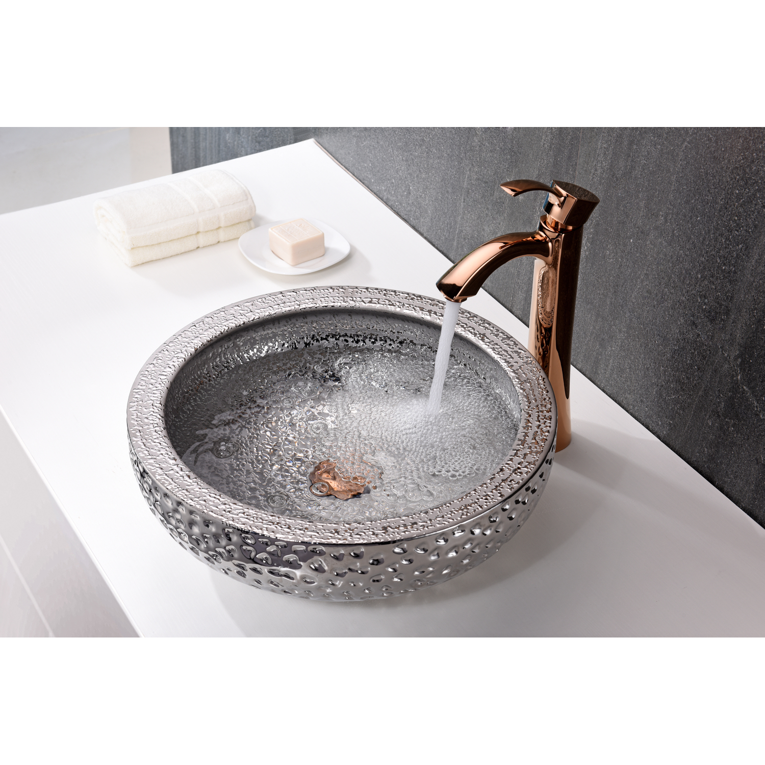 The ANZZI Levi Series sink is a traditionally crafted round vessel sink adorned in a Speckled Silver finish. Each ANZZI vessel sink is formed using RHINO ALLOY certified high tempered Deco-Glass material. The result is an elegantly shaped and captivating vessel centerpiece for any bathroom counter.RHINO ALLOY certified tempered deco-glass construction in a stunning Speckled Silver finishScratch-tough and stain-resistant non-porous surfaceEasy-to-clean low maintenanceTop mount installationDimensions: 16.5 in. L x 16.5 in. W x 5.9 in. HDeco-glass thickness: 1/2 in.Single 1.75 in. standard drain openingANZZI Polished Chrome pop-up drain includedShips from factory within 24 hours once order is processedLimited Lifetime WarrantyTo speak to a knowledgeable and dedicated ANZZI specialist simply call 1-844-44-ANZZI or visit us on the web at www.ANZZI.com