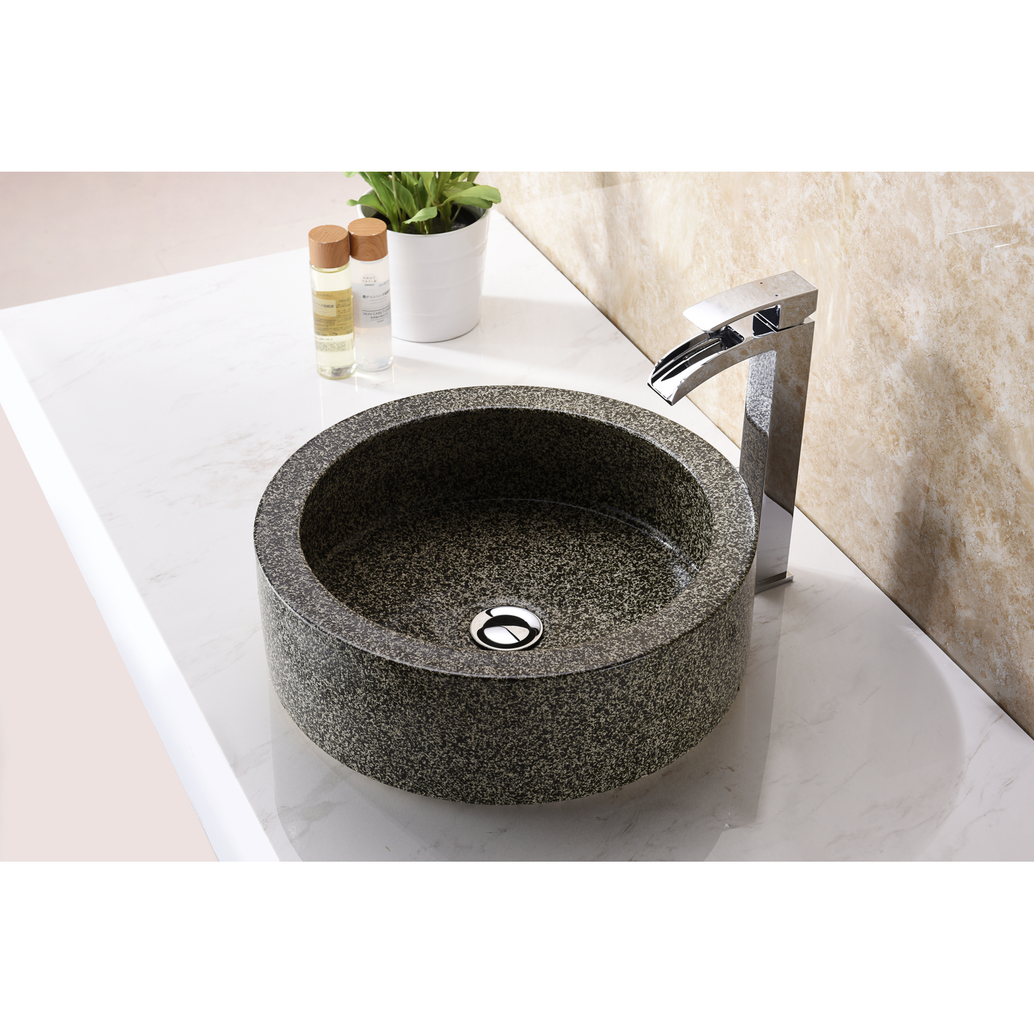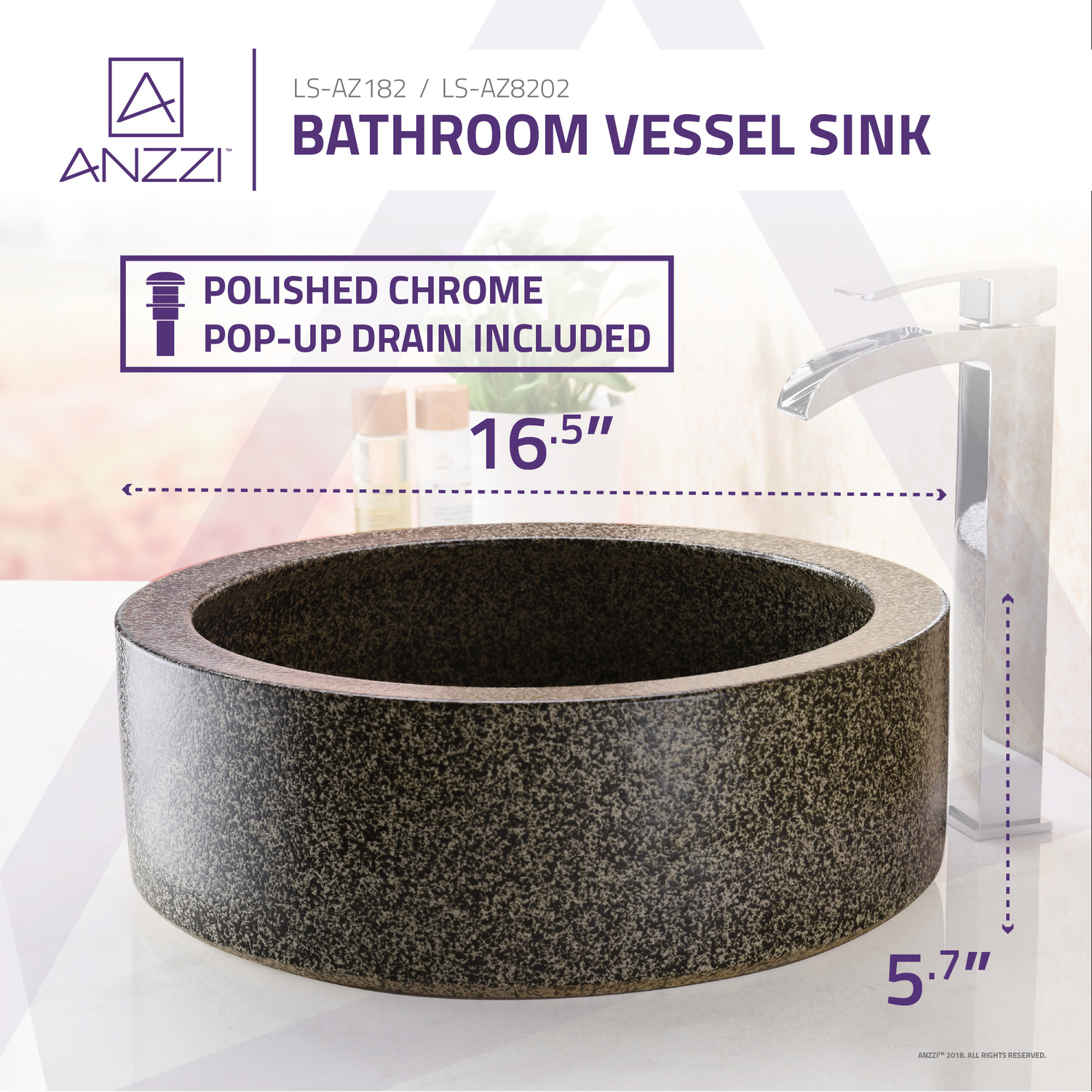 The ANZZI Samauga sink is a traditionally crafted round vessel sink adorned in a Speckled Stone finish. Each ANZZI vessel sink is formed using RHINO ALLOY certified high tempered Deco-Glass material. The result is an elegantly shaped and captivating vessel centerpiece for any bathroom counter.RHINO ALLOY certified tempered deco-glass construction in a stunning Speckled Stone finishScratch-tough and stain-resistant non-porous surfaceEasy-to-clean low maintenanceTop mount installationDimensions: 16.5 in. L x 16.5 in. W x 5.7 in. HDeco-glass thickness: 1/2 in.Single 1.75 in. standard drain openingANZZI Polished Chrome pop-up drain includedShips from factory within 24 hours once order is processedLimited Lifetime WarrantyTo speak to a knowledgeable and dedicated ANZZI specialist simply call 1-844-44-ANZZI or visit us on the web at www.ANZZI.com