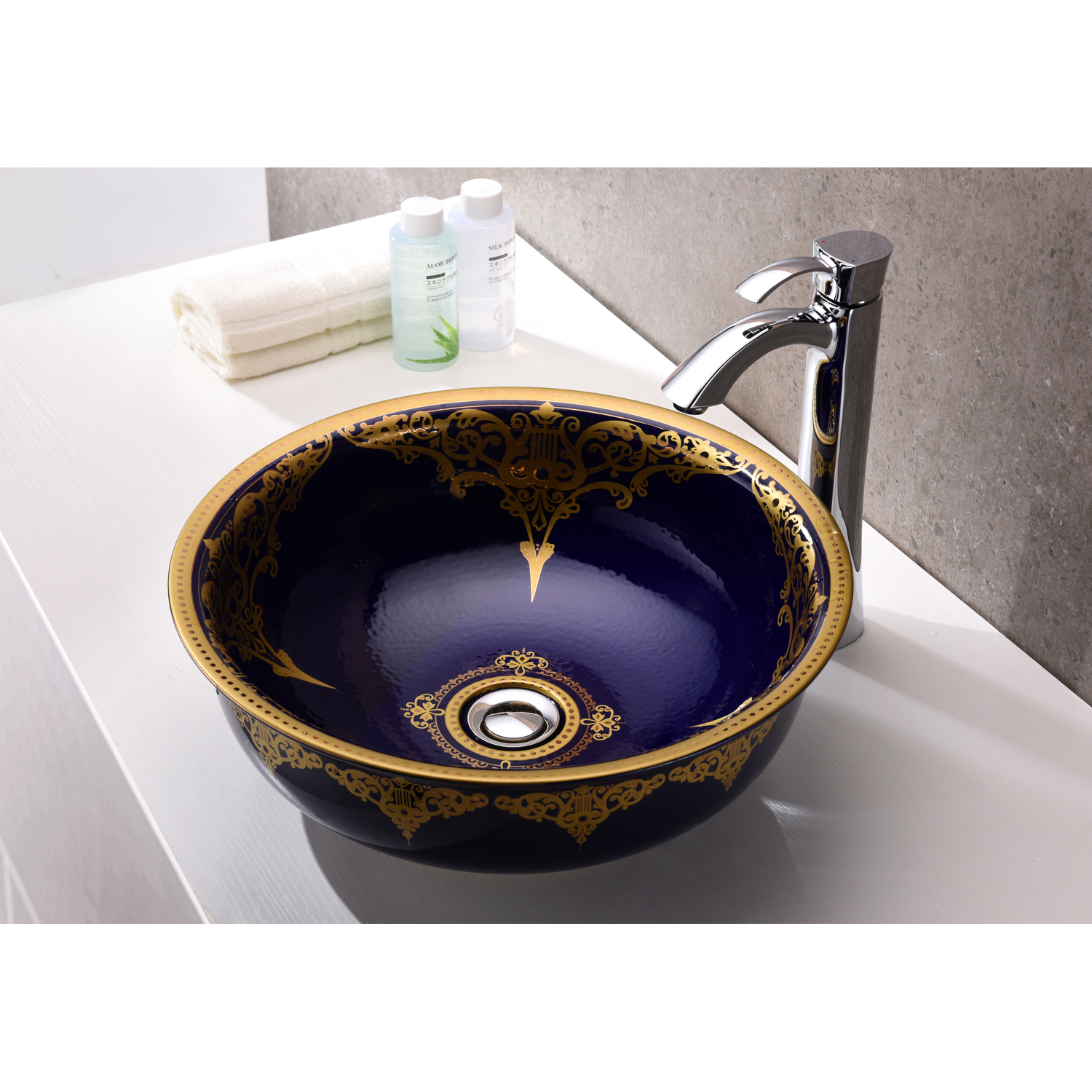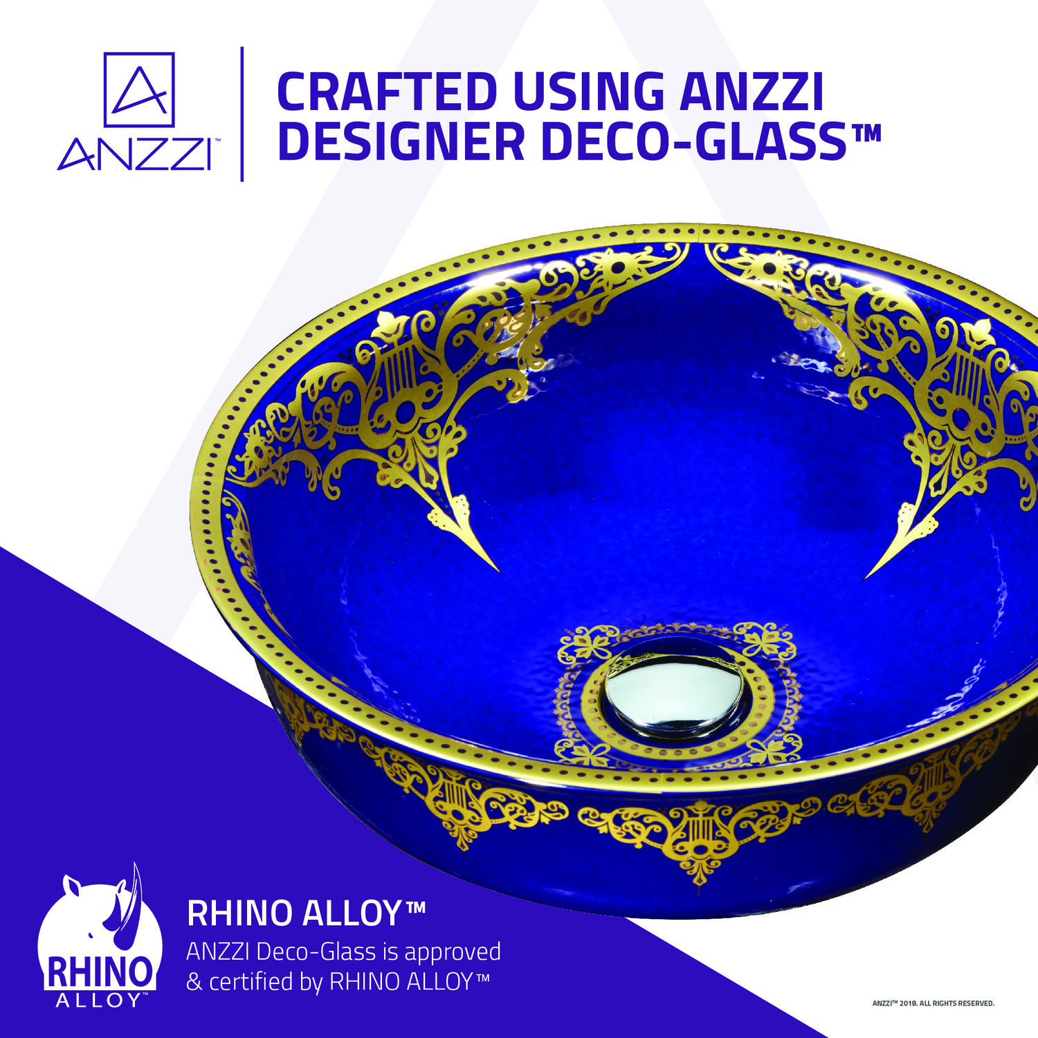 The ANZZI Sauano Series sink is a traditionally crafted round vessel sink adorned in a Royal Blue finish. Each ANZZI vessel sink is formed using RHINO ALLOY certified high tempered Deco-Glass material. The result is an elegantly shaped and captivating vessel centerpiece for any bathroom counter.RHINO ALLOY certified tempered deco-glass construction in a stunning Royal Blue finishScratch-tough and stain-resistant non-porous surfaceEasy-to-clean low maintenanceTop mount installationDimensions: 16.5 in. L x 16.5 in. W x 5.9 in. HDeco-glass thickness: 1/2 in.Single 1.75 in. standard drain openingANZZI Polished Chrome pop-up drain includedShips from factory within 24 hours once order is processedLimited Lifetime WarrantyTo speak to a knowledgeable and dedicated ANZZI specialist simply call 1-844-44-ANZZI or visit us on the web at www.ANZZI.com