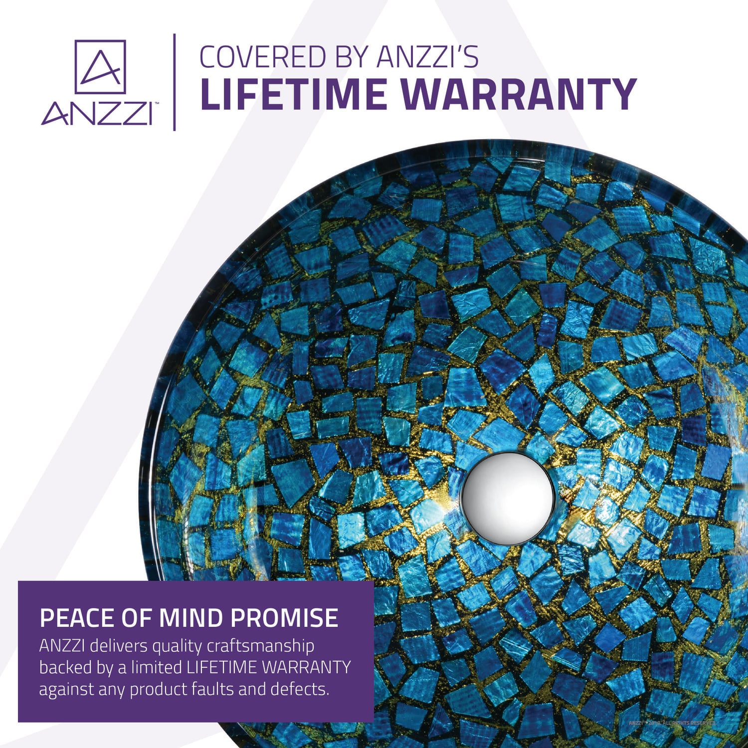The ANZZI Chipasi Series sink is a traditionally crafted round vessel sink adorned in a Blue/Gold Chipasi finish. Each ANZZI vessel sink is formed using RHINO ALLOY certified high tempered Deco-Glass material. The result is an elegantly shaped and captivating vessel centerpiece for any bathroom counter.RHINO ALLOY certified tempered deco-glass construction in a stunning Blue/Gold Chipasi finishScratch-tough and stain-resistant non-porous surfaceEasy-to-clean low maintenanceTop mount installationDimensions: 16.5 in. L x 16.5 in. W x 5.7 in. HDeco-glass thickness: 1/2 in.Single 1.75 in. standard drain openingANZZI Polished Chrome pop-up drain includedShips from factory within 24 hours once order is processedLimited Lifetime WarrantyTo speak to a knowledgeable and dedicated ANZZI specialist simply call 1-844-44-ANZZI or visit us on the web at www.ANZZI.com