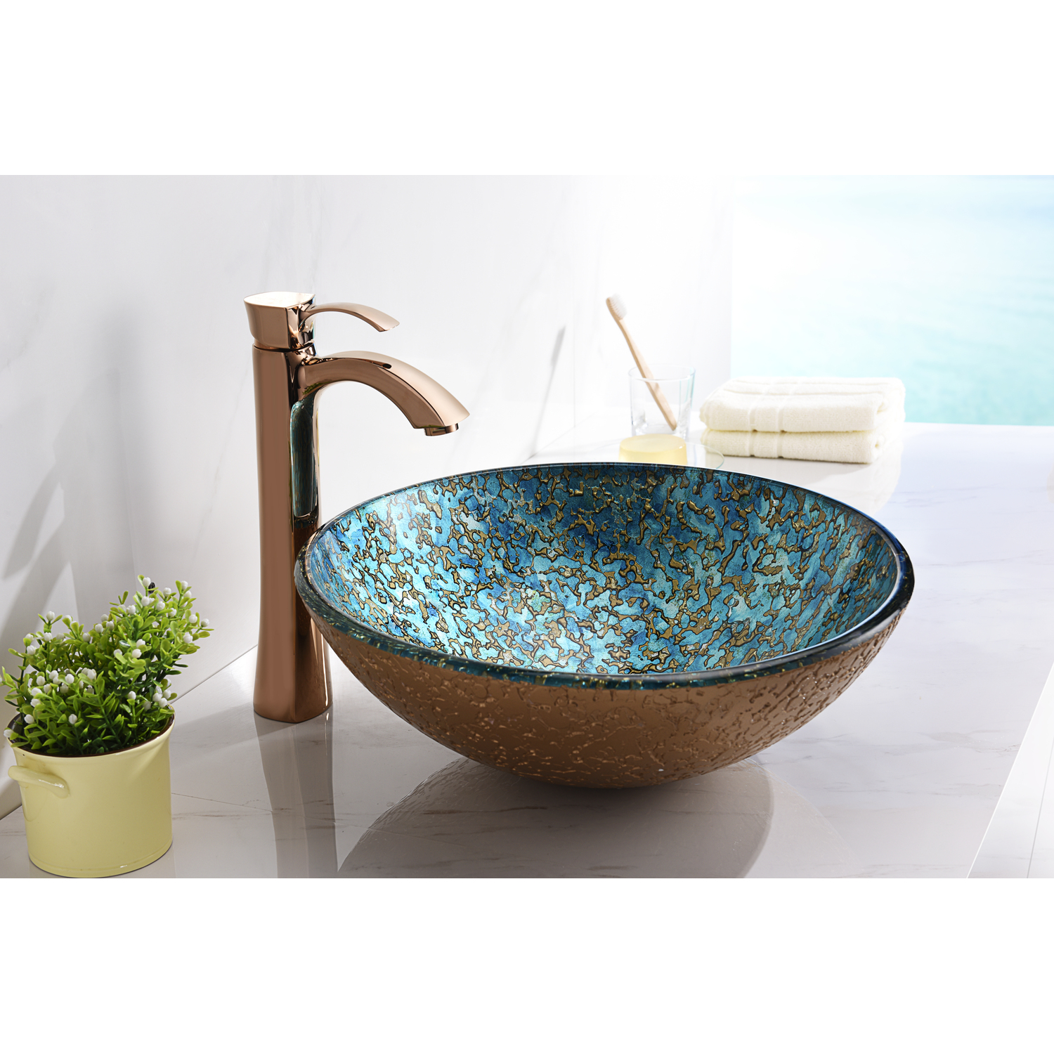 The ANZZI Makata Series sink is a traditionally crafted round vessel sink adorned in a Gold/Cyan Mix finish. Each ANZZI vessel sink is formed using RHINO ALLOY certified high tempered Deco-Glass material. The result is an elegantly shaped and captivating vessel centerpiece for any bathroom counter.RHINO ALLOY certified tempered deco-glass construction in a stunning Gold/Cyan Mix finishScratch-tough and stain-resistant non-porous surfaceEasy-to-clean low maintenanceTop mount installationDimensions: 16.5 in. L x 16.5 in. W x 5.7 in. HDeco-glass thickness: 1/2 in.Single 1.75 in. standard drain openingANZZI Polished Chrome pop-up drain includedShips from factory within 24 hours once order is processedLimited Lifetime WarrantyTo speak to a knowledgeable and dedicated ANZZI specialist simply call 1-844-44-ANZZI or visit us on the web at www.ANZZI.com