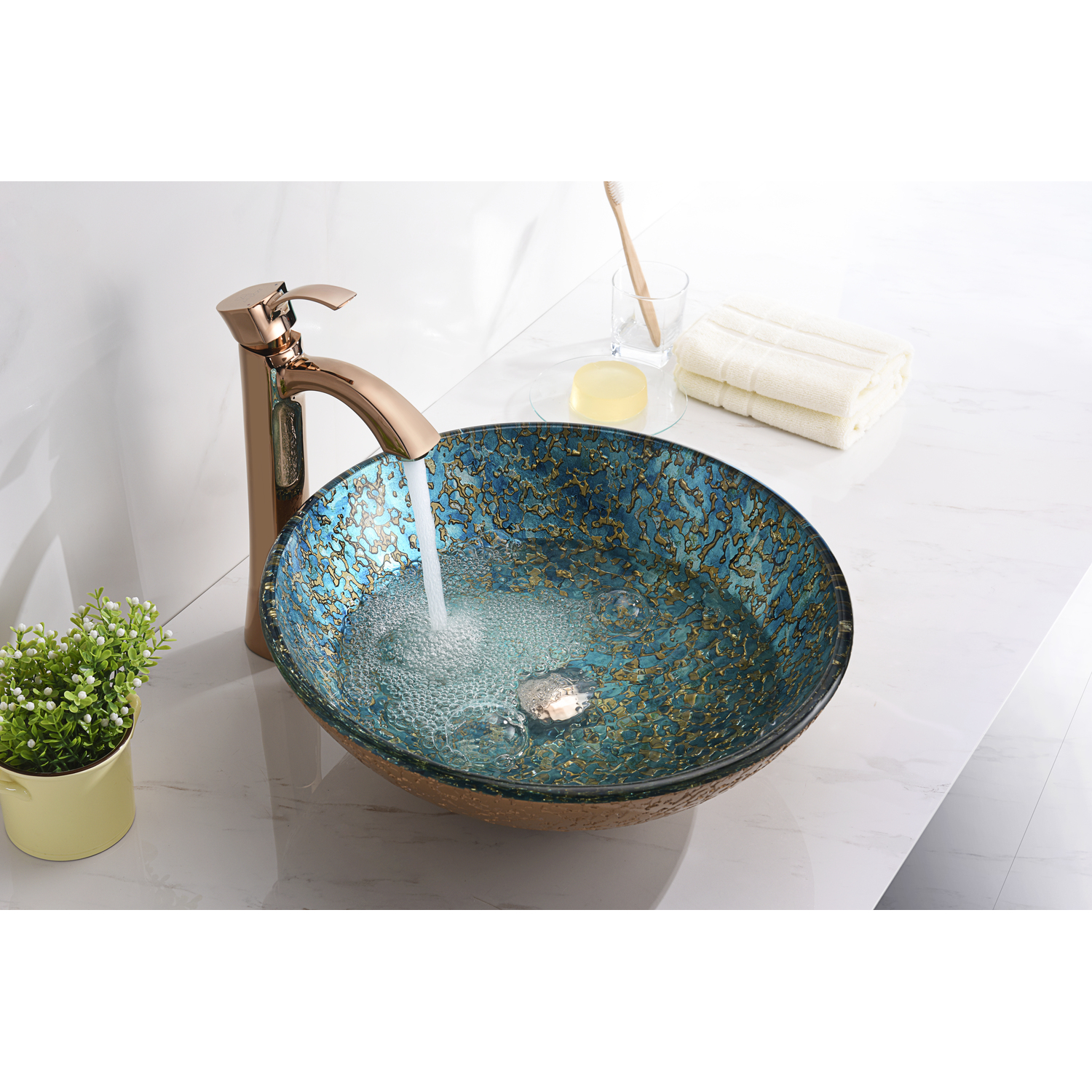 The ANZZI Makata Series sink is a traditionally crafted round vessel sink adorned in a Gold/Cyan Mix finish. Each ANZZI vessel sink is formed using RHINO ALLOY certified high tempered Deco-Glass material. The result is an elegantly shaped and captivating vessel centerpiece for any bathroom counter.RHINO ALLOY certified tempered deco-glass construction in a stunning Gold/Cyan Mix finishScratch-tough and stain-resistant non-porous surfaceEasy-to-clean low maintenanceTop mount installationDimensions: 16.5 in. L x 16.5 in. W x 5.7 in. HDeco-glass thickness: 1/2 in.Single 1.75 in. standard drain openingANZZI Polished Chrome pop-up drain includedShips from factory within 24 hours once order is processedLimited Lifetime WarrantyTo speak to a knowledgeable and dedicated ANZZI specialist simply call 1-844-44-ANZZI or visit us on the web at www.ANZZI.com