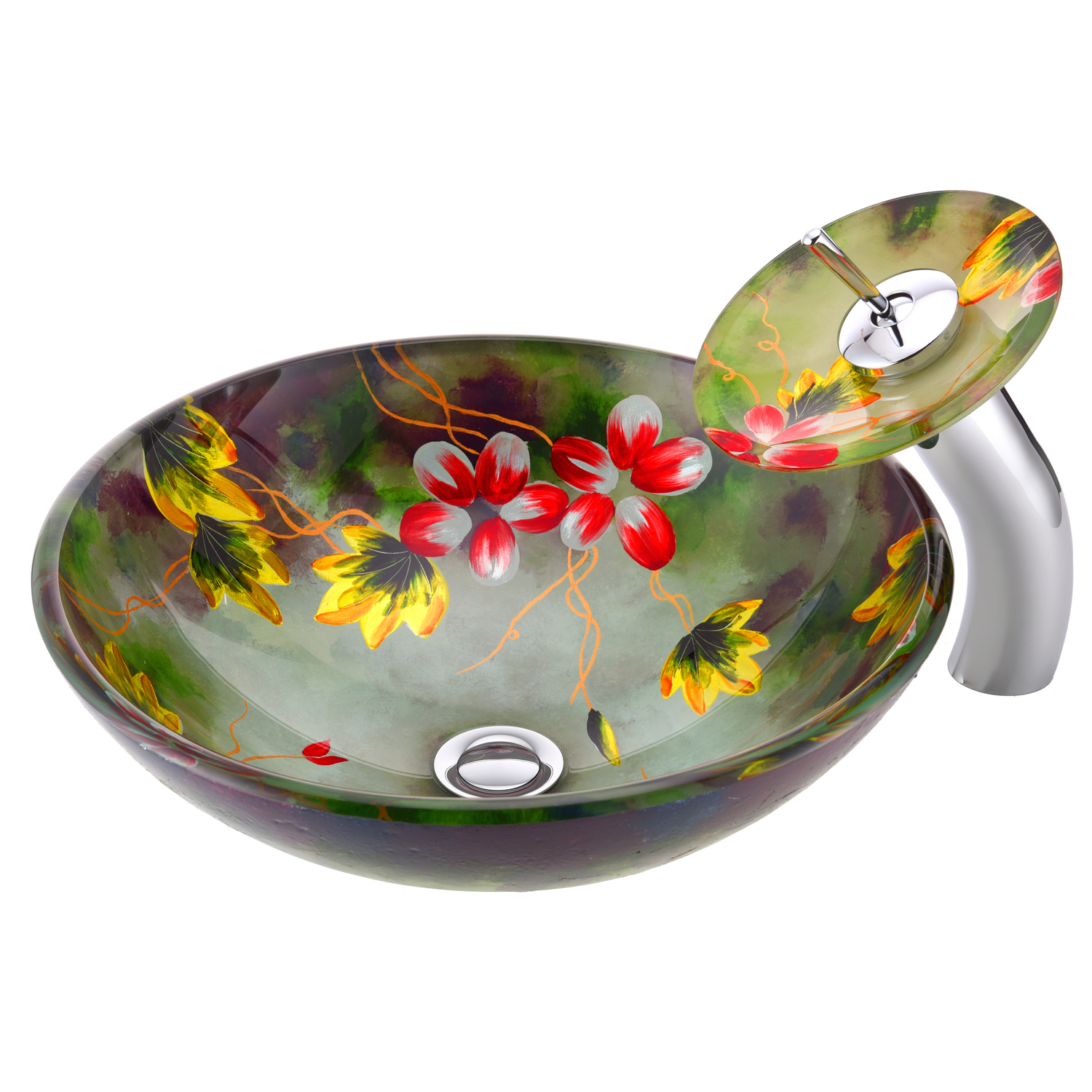 The ANZZI Panye Series sink is a traditionally crafted round vessel sink adorned in a Hand Painted Mural finish. Each ANZZI vessel sink is formed using RHINO ALLOY certified high tempered Deco-Glass material. The result is an elegantly shaped and captivating vessel centerpiece for any bathroom counter.RHINO ALLOY certified tempered deco-glass construction in a stunning Hand Painted Mural finishScratch-tough and stain-resistant non-porous surfaceEasy-to-clean low maintenanceMatching chrome trimmed waterfall faucet includedDimensions: 16.5 in. L x 16.5 in. W x 5.7 in. HDeco-glass thickness: 1/2 in.Single 1.75 in. standard drain openingANZZI Polished Chrome pop-up drain includedShips from factory within 24 hours once order is processedLimited Lifetime WarrantyTo speak to a knowledgeable and dedicated ANZZI specialist simply call 1-844-44-ANZZI or visit us on the web at www.ANZZI.com