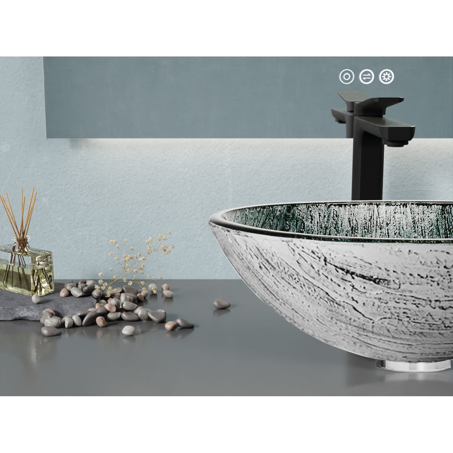 Bold, beautiful, breathtaking — it’s what you want for your bathroom décor, and it’s what you get with our striking Amalfi sink. The premium glass basin is finished in a Stellar Grey that’s sure to make it the star of any bathroom space. The vessel design mounts to the top of your vanity or countertop (instead of into it), creating a look that’s chic and unique while freeing up space in the cabinet below. Compact style is perfect for smaller powder rooms. Includes a chrome pop-up drain.SMART, SOPHISTICATED DESIGN — the sublime artistic styling stands out in all the right ways, while saving space in your bathroom or powder roomSTURDY ONE-PIECE CONSTRUCTION — built from premium glass, so you can be confident your Amalfi sink will stand the test of timeSTRIKING STELLAR GREY FINISH — looks gorgeous year after yearCOMES COMPLETE WITH CHROME POP-UP DRAIN — your sink is ready to install right out of the boxINNER DIMENSIONS — 15.55 in. Diam. x 5.23 in. HOUTER DIMENSIONS — 16.5 in. Diam. x 5.7 in. HBOTTOM WIDTH — 1.77 in.INCLUDES EVERYTHING YOU NEED — package includes drain assembly and mounting hardwareLIMITED LIFETIME WARRANTY — when you buy it, we back it, so you can be confident in the quality of our productsGET IT FAST — ships from warehouse within 24 hours of order processingCURBSIDE DELIVERY — buying an ANZZI product is always easy and convenientProfessional installation highly recommendedAlso available in Stellar Black #LS-AZ902, Matte Black #LS-AZ905MB