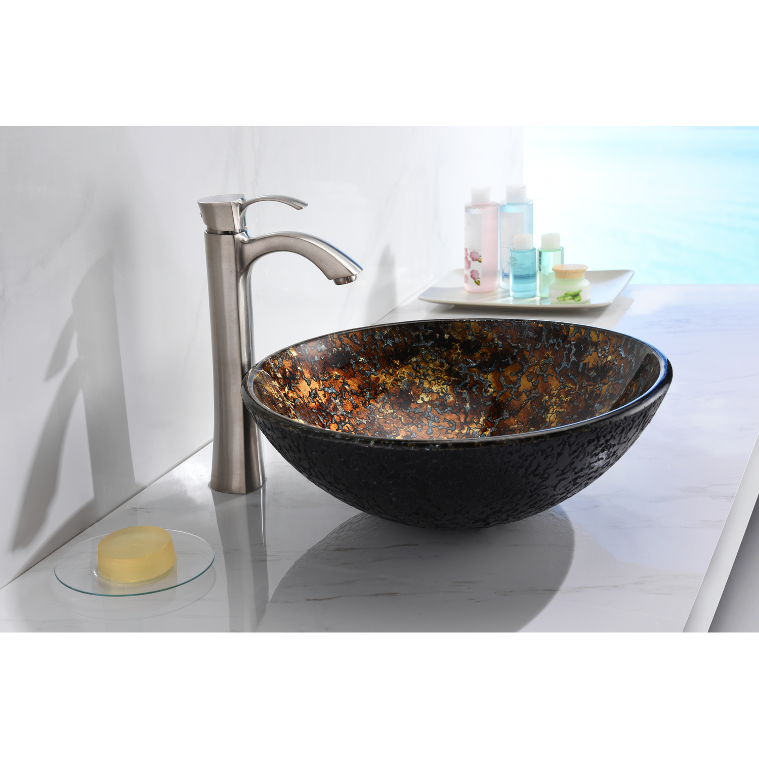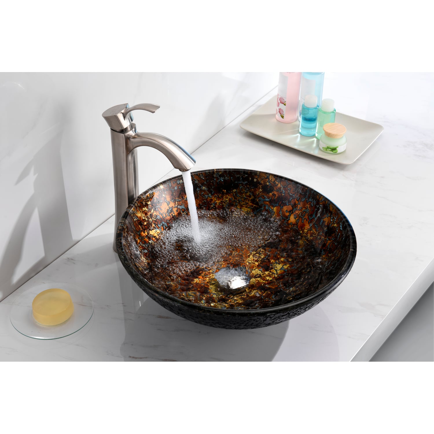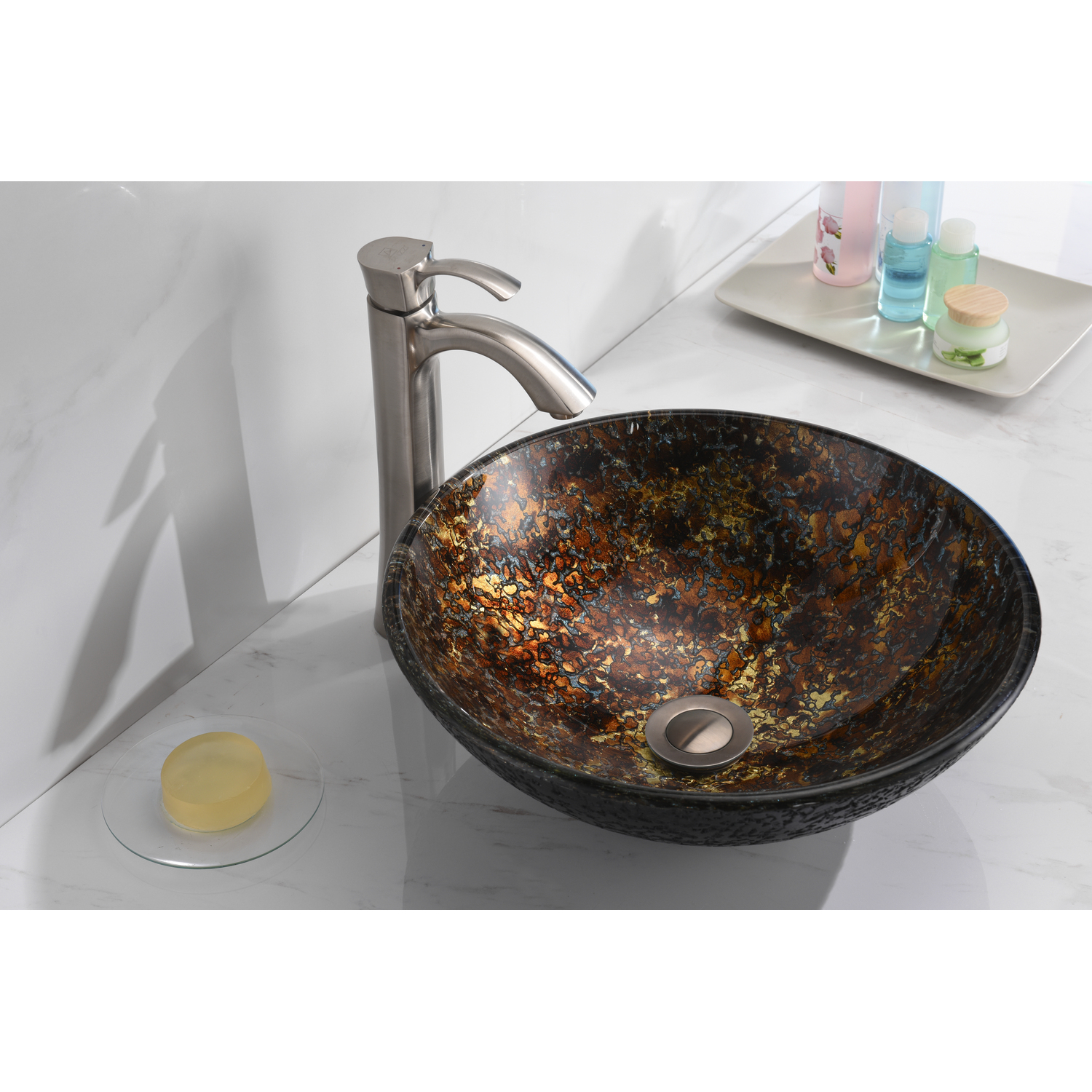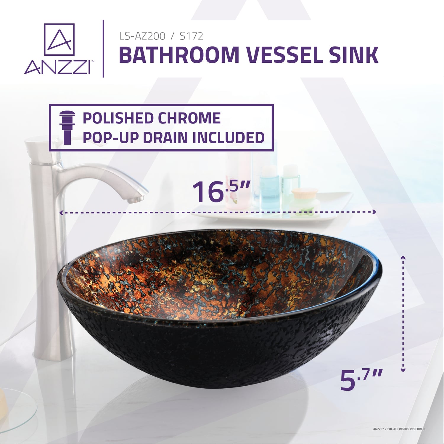 The ANZZI Tuasavi Series sink is a traditionally crafted round vessel sink adorned in a Molten Gold finish. Each ANZZI vessel sink is formed using RHINO ALLOY certified high tempered Deco-Glass material. The result is an elegantly shaped and captivating vessel centerpiece for any bathroom counter.RHINO ALLOY certified tempered deco-glass construction in a stunning Molten Gold finishScratch-tough and stain-resistant non-porous surfaceEasy-to-clean low maintenanceTop mount installationDimensions: 16.5 in. L x 16.5 in. W x 5.7 in. HDeco-glass thickness: 1/2 in.Single 1.75 in. standard drain openingANZZI Polished Chrome pop-up drain includedShips from factory within 24 hours once order is processedLimited Lifetime WarrantyTo speak to a knowledgeable and dedicated ANZZI specialist simply call 1-844-44-ANZZI or visit us on the web at www.ANZZI.com
