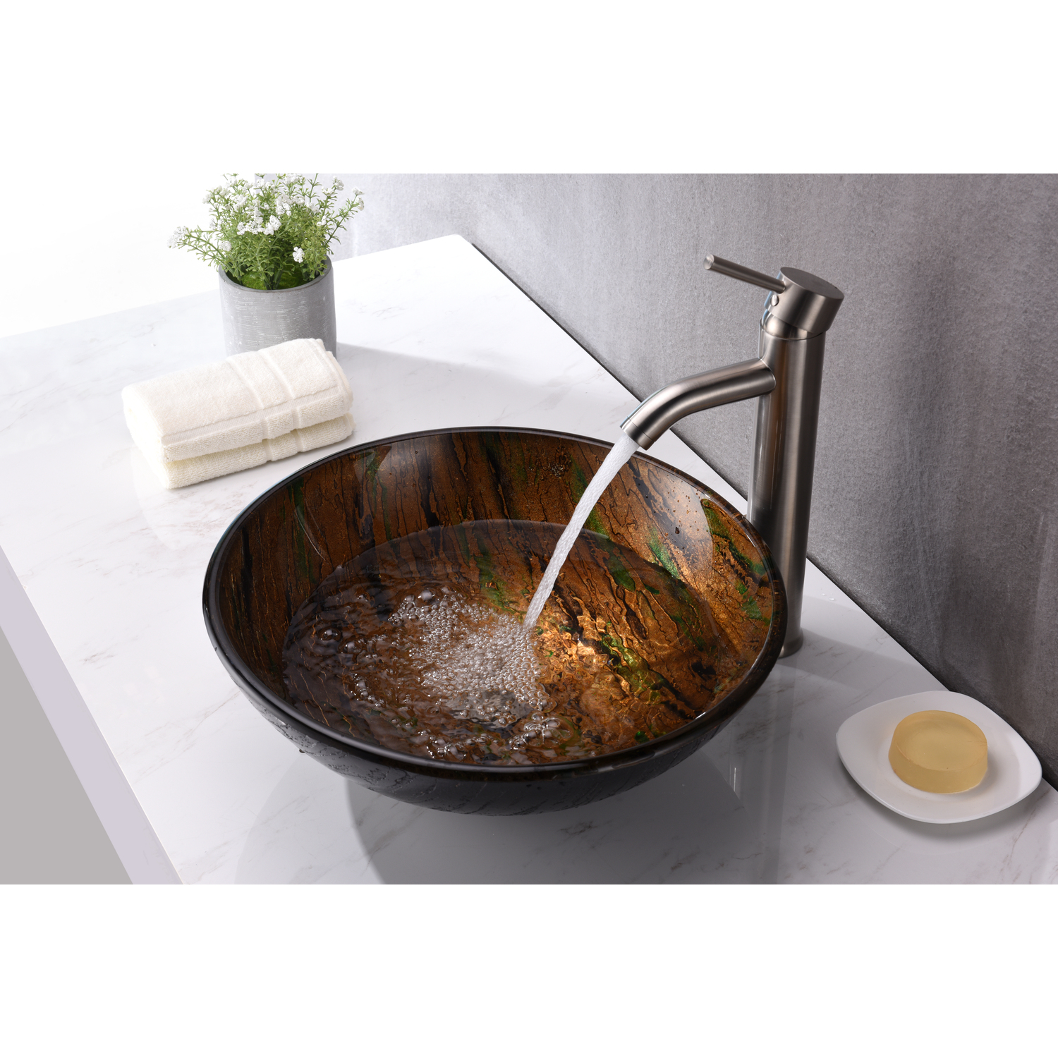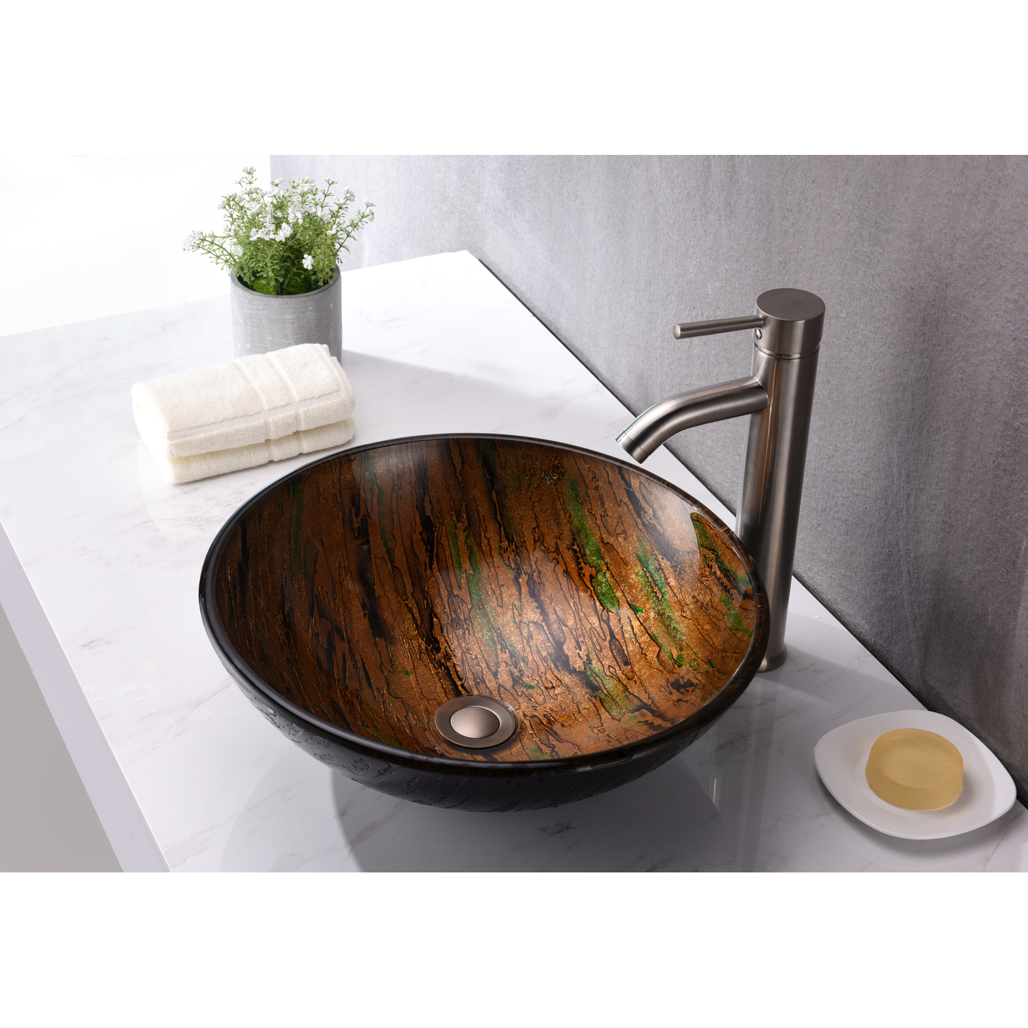 The ANZZI Gwazeni Series sink is a traditionally crafted round vessel sink adorned in a Shifting Earth finish. Each ANZZI vessel sink is formed using RHINO ALLOY certified high tempered Deco-Glass material. The result is an elegantly shaped and captivating vessel centerpiece for any bathroom counter.RHINO ALLOY certified tempered deco-glass construction in a stunning Shifting Earth finishScratch-tough and stain-resistant non-porous surfaceEasy-to-clean low maintenanceTop mount installationDimensions: 16.5 in. L x 16.5 in. W x 5.7 in. HDeco-glass thickness: 1/2 in.Single 1.75 in. standard drain openingANZZI Polished Chrome pop-up drain includedShips from factory within 24 hours once order is processedLimited Lifetime WarrantyTo speak to a knowledgeable and dedicated ANZZI specialist simply call 1-844-44-ANZZI or visit us on the web at www.ANZZI.com
