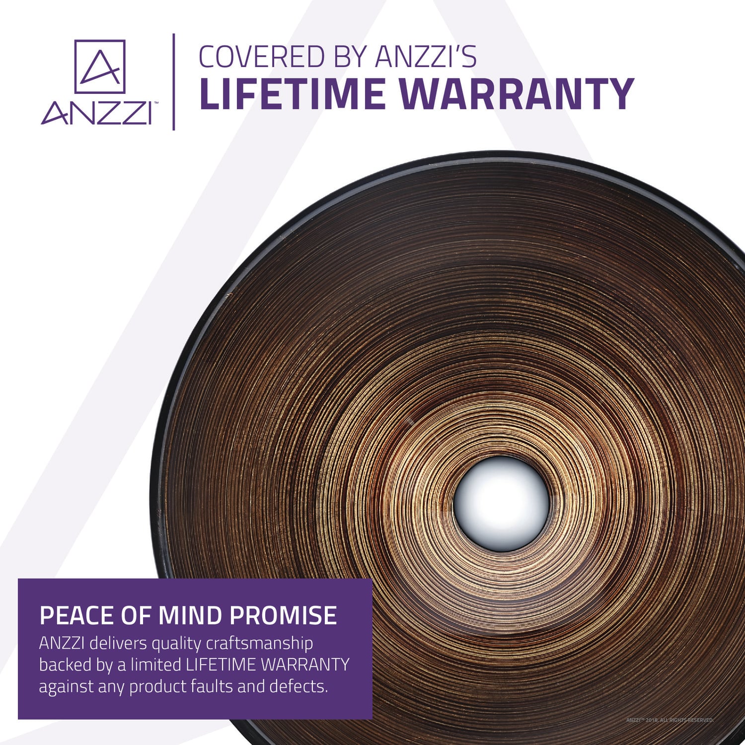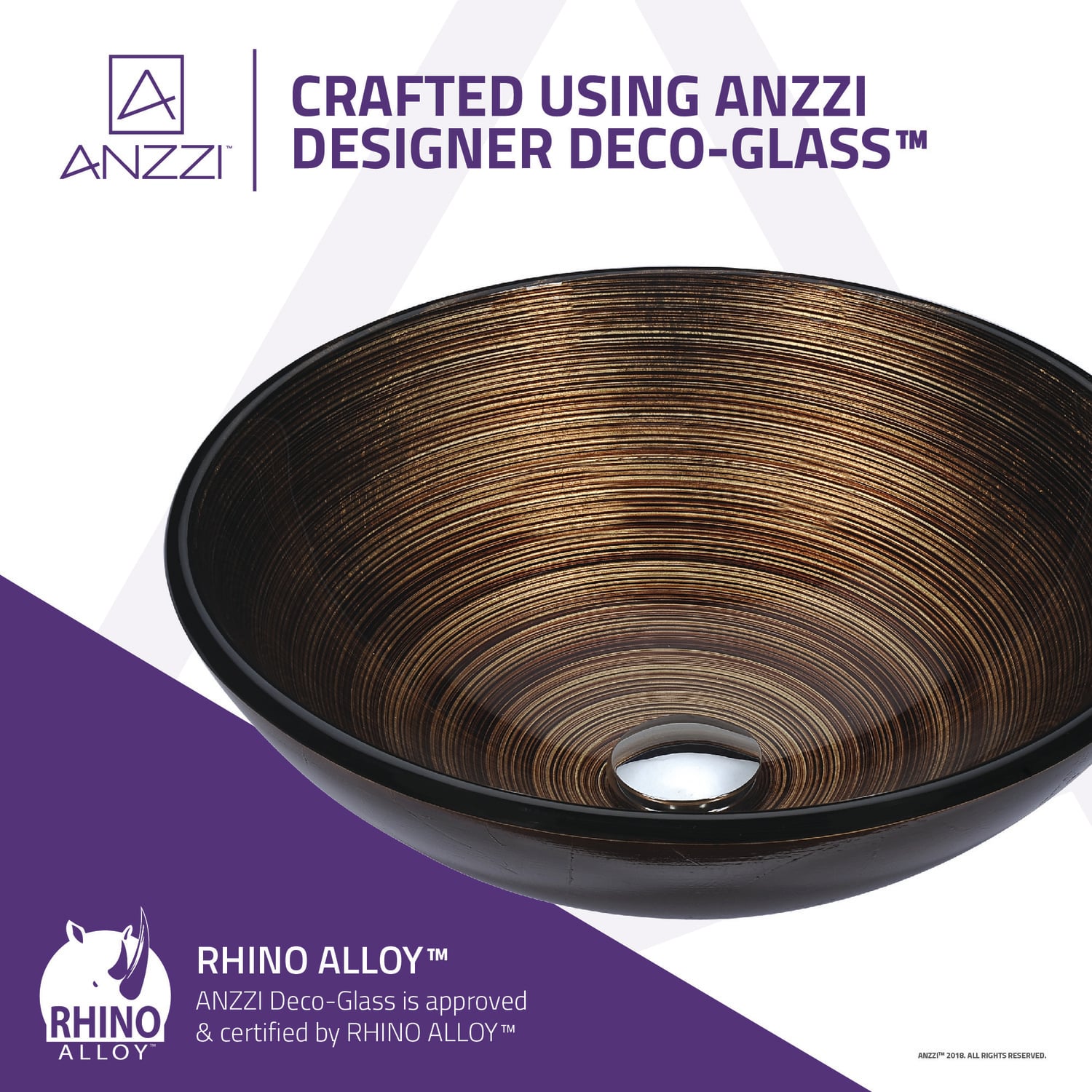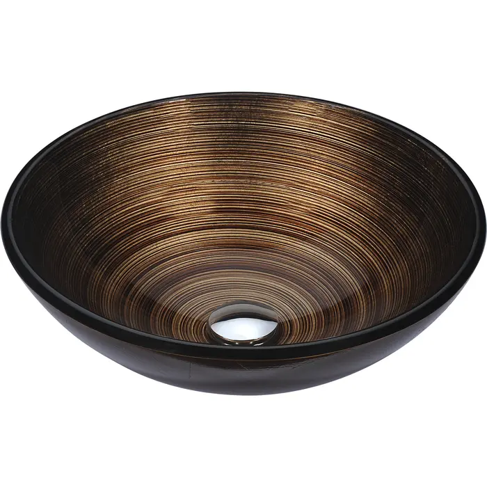 The ANZZI Gardena Series sink is a traditionally crafted round vessel sink adorned in a Radial Umber finish. Each ANZZI vessel sink is formed using RHINO ALLOY certified high tempered Deco-Glass material. The result is an elegantly shaped and captivating vessel centerpiece for any bathroom counter.RHINO ALLOY certified tempered deco-glass construction in a stunning Radial Umber finishScratch-tough and stain-resistant non-porous surfaceEasy-to-clean low maintenanceTop mount installationDimensions: 16.5 in. L x 16.5 in. W x 5.7 in. HDeco-glass thickness: 1/2 in.Single 1.75 in. standard drain openingANZZI polished chrome pop-up drain includedShips from factory within 24 hours once order is processedLifetime WarrantyTo speak to a knowledgeable and dedicated ANZZI specialist simply call 1-844-44-ANZZI or visit us on the web at www.ANZZI.com