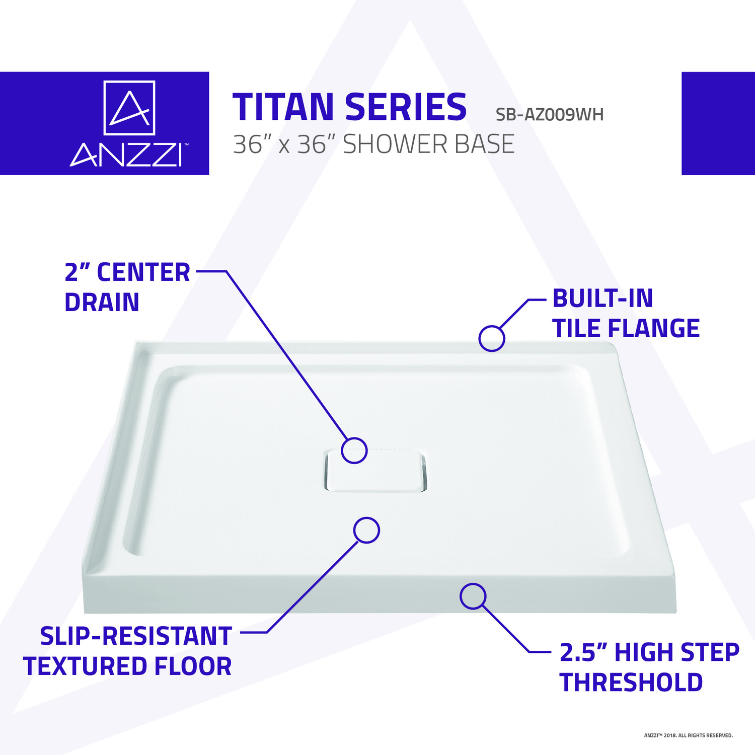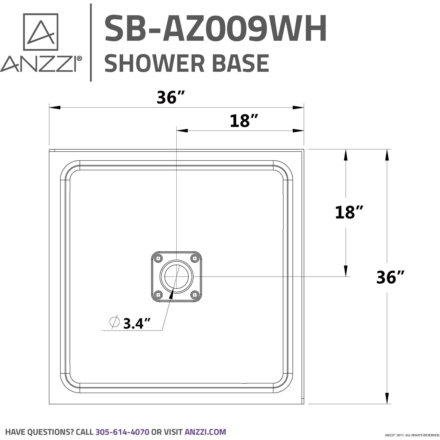 Trust ANZZI to provide the perfect foundation for your new dream shower. ANZZI shower bases are legendary for their durable resilience and high performance reliability. ANZZI craftsman use only RHINO ALLOY certified materials such as marine grade acrylic and high yield fiberglass to deliver a durable and stylish shower base unit. The glossy evenly coated finish is a striking eye catcher which compliments and enhances any style of bathroom.Overall dimensions: 36" W x 36" L x 3.54" HDurable RHINO ALLOY certified marine grade acrylic in bright and vibrant white finishScratch resilient easy to clean surfacecUPC certifiedCorner style installation with integrated 1" tile flangeCenter side drain location (drain assembly not included)Slip resistant textured flooringShips from warehouse within 24 hours of order processingLimited lifetime warrantyTo speak to a knowledgeable and dedicated ANZZI specialist simply call 1-844-44-ANZZI or visit us on the web at www.ANZZI.com