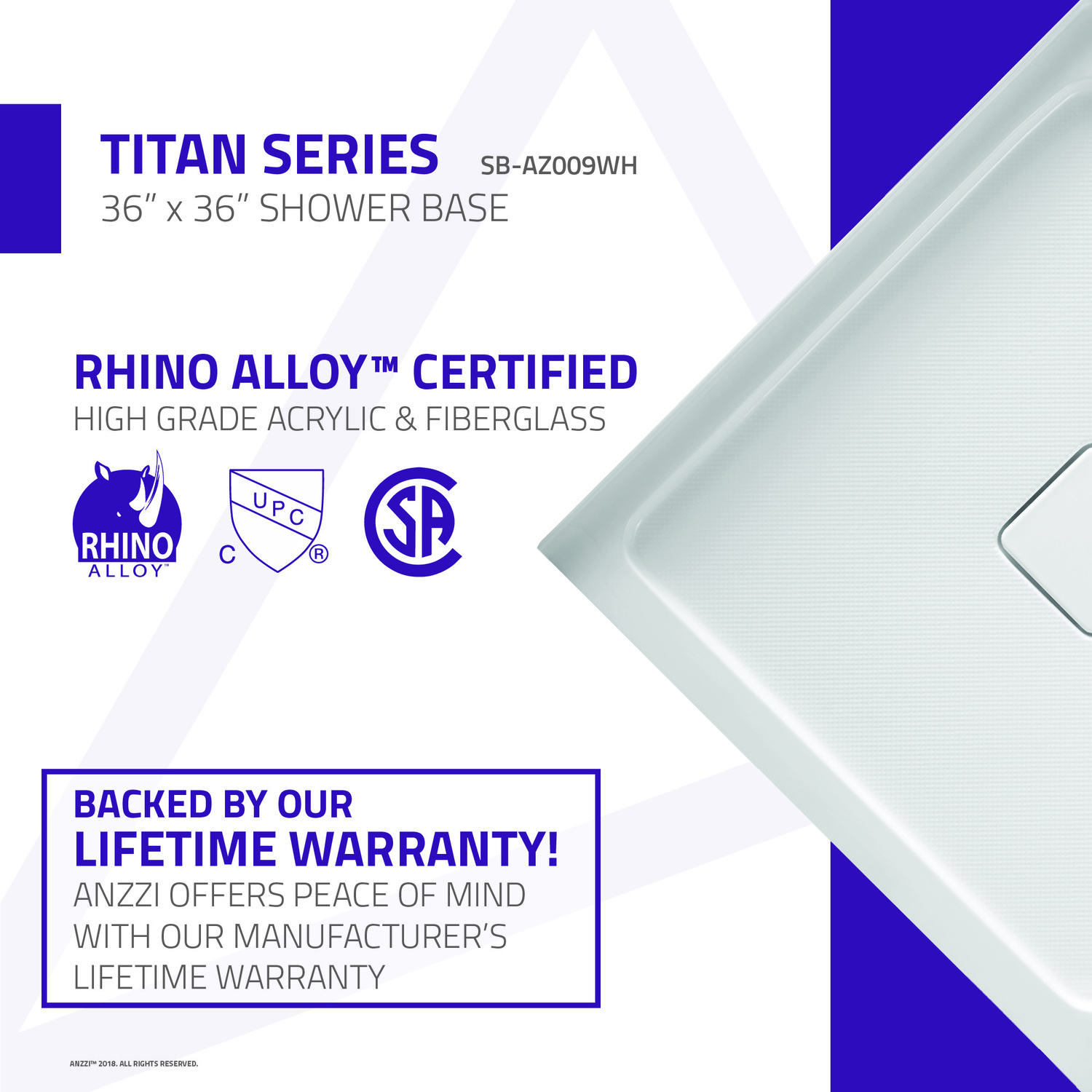 Trust ANZZI to provide the perfect foundation for your new dream shower. ANZZI shower bases are legendary for their durable resilience and high performance reliability. ANZZI craftsman use only RHINO ALLOY certified materials such as marine grade acrylic and high yield fiberglass to deliver a durable and stylish shower base unit. The glossy evenly coated finish is a striking eye catcher which compliments and enhances any style of bathroom.Overall dimensions: 36" W x 36" L x 3.54" HDurable RHINO ALLOY certified marine grade acrylic in bright and vibrant white finishScratch resilient easy to clean surfacecUPC certifiedCorner style installation with integrated 1" tile flangeCenter side drain location (drain assembly not included)Slip resistant textured flooringShips from warehouse within 24 hours of order processingLimited lifetime warrantyTo speak to a knowledgeable and dedicated ANZZI specialist simply call 1-844-44-ANZZI or visit us on the web at www.ANZZI.com
