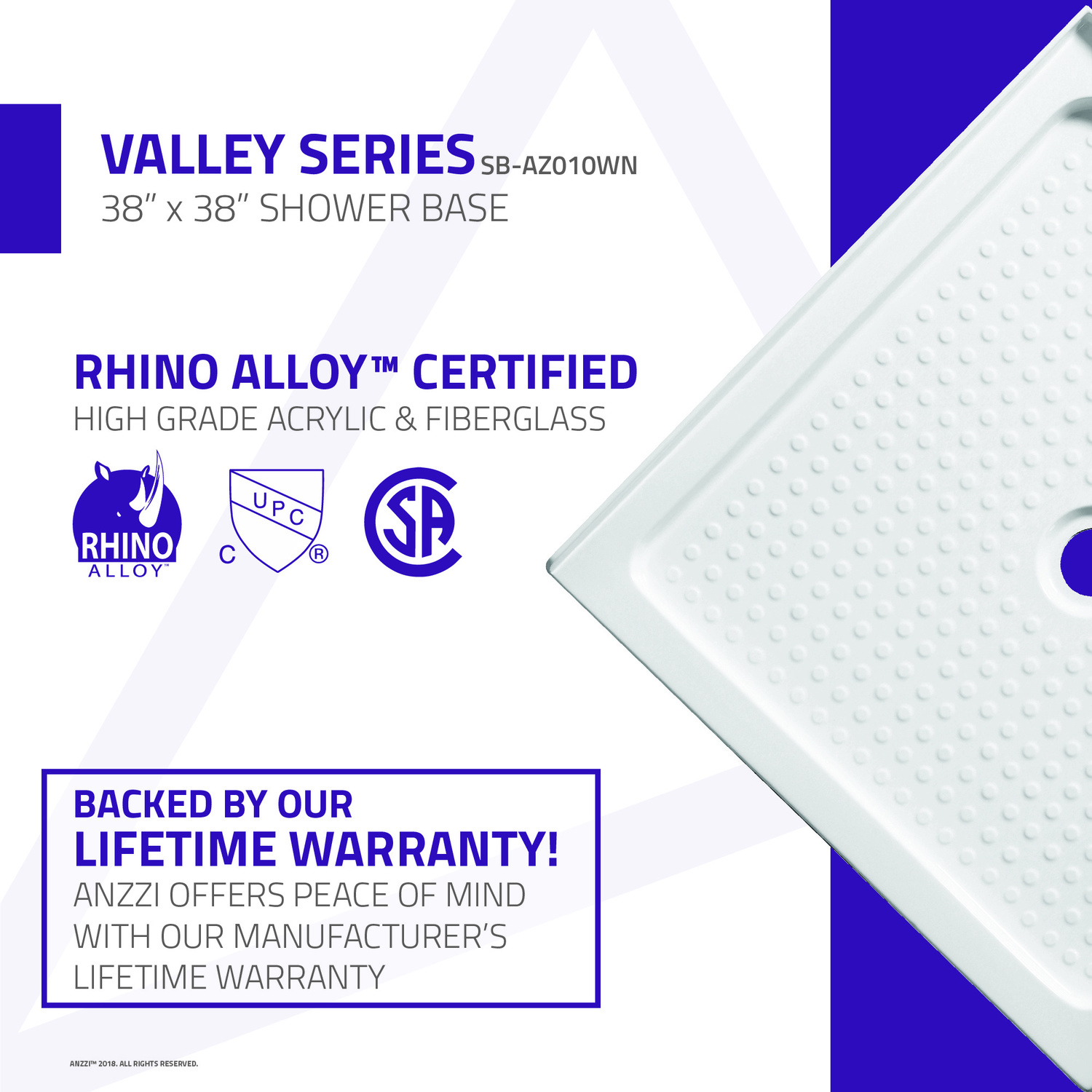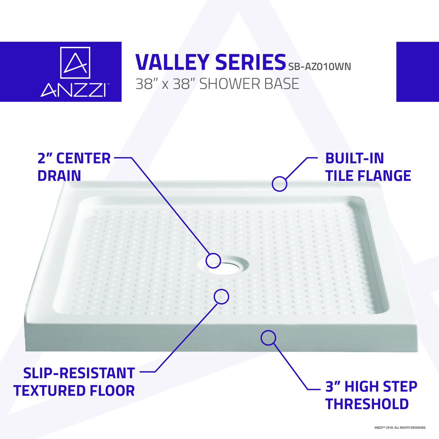ANZZI is here to offer the perfect foundation for any modern shower enclosure. The ANZZI VALLEY foundational shower base is crafted using high-end acrylic and molded into a super sturdy contemporary style that will match brilliantly with any of today's most popular decors. The ANZZI VALLEY is engineered for efficient drainage, elegantly textured for a sure slip-resistant footing and built for long lasting reliability. To take your shower to the next level you must begin with a solid foundation and that is exactly what ANZZI shower bases provide.Modern squared shapeOverall size: 38 in. L x 38 in. W x 4 in. HEasy to handle RHINO ALLOY certified marine grade acrylic in bright and vibrant white finishScratch resilient easy to clean surfaceIntegrated slip-resistant texture for a safe and secure footTwo (2) sided flange corner installationCenter drain locationDrain assembly not includedEngineered to pair with ANZZI's shower wall collection: SW-AZ007WHShips from factory within 24 hours once order is processedLimited Lifetime WarrantyTo speak to a knowledgeable and dedicated ANZZI specialist simply call 1-844-44-ANZZI or visit us on the web at www.ANZZI.comCurbside delivery