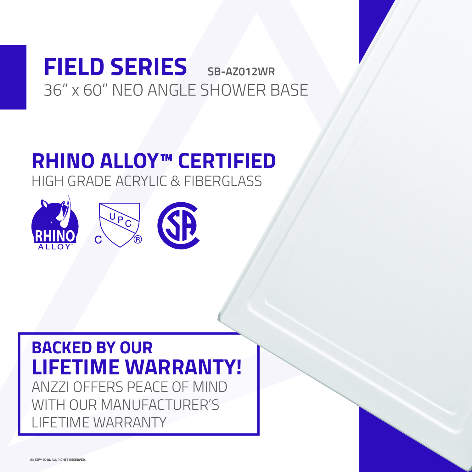 Trust ANZZI to provide the perfect foundation for your new dream shower. ANZZI shower bases are legendary for their durable resilience and high performance reliability. ANZZI craftsman use only RHINO ALLOY certified materials such as marine grade acrylic and high yield fiberglass to deliver a durable and stylish shower base unit. The glossy evenly coated finish is a striking eye catcher which compliments and enhances any style of bathroom.Overall dimensions: 60" W x 36" L x 3.5" HDurable RHINO ALLOY certified marine grade acrylic in bright and vibrant white finishScratch resilient easy to clean surfacecUPC certifiedCorner style installation with integrated 1" tile flangeLeft side drain location (drain assembly not included)Slip resistant textured flooringShips from warehouse within 24 hours of order processingLimited lifetime warrantyTo speak to a knowledgeable and dedicated ANZZI specialist simply call 1-844-44-ANZZI or visit us on the web at www.ANZZI.com