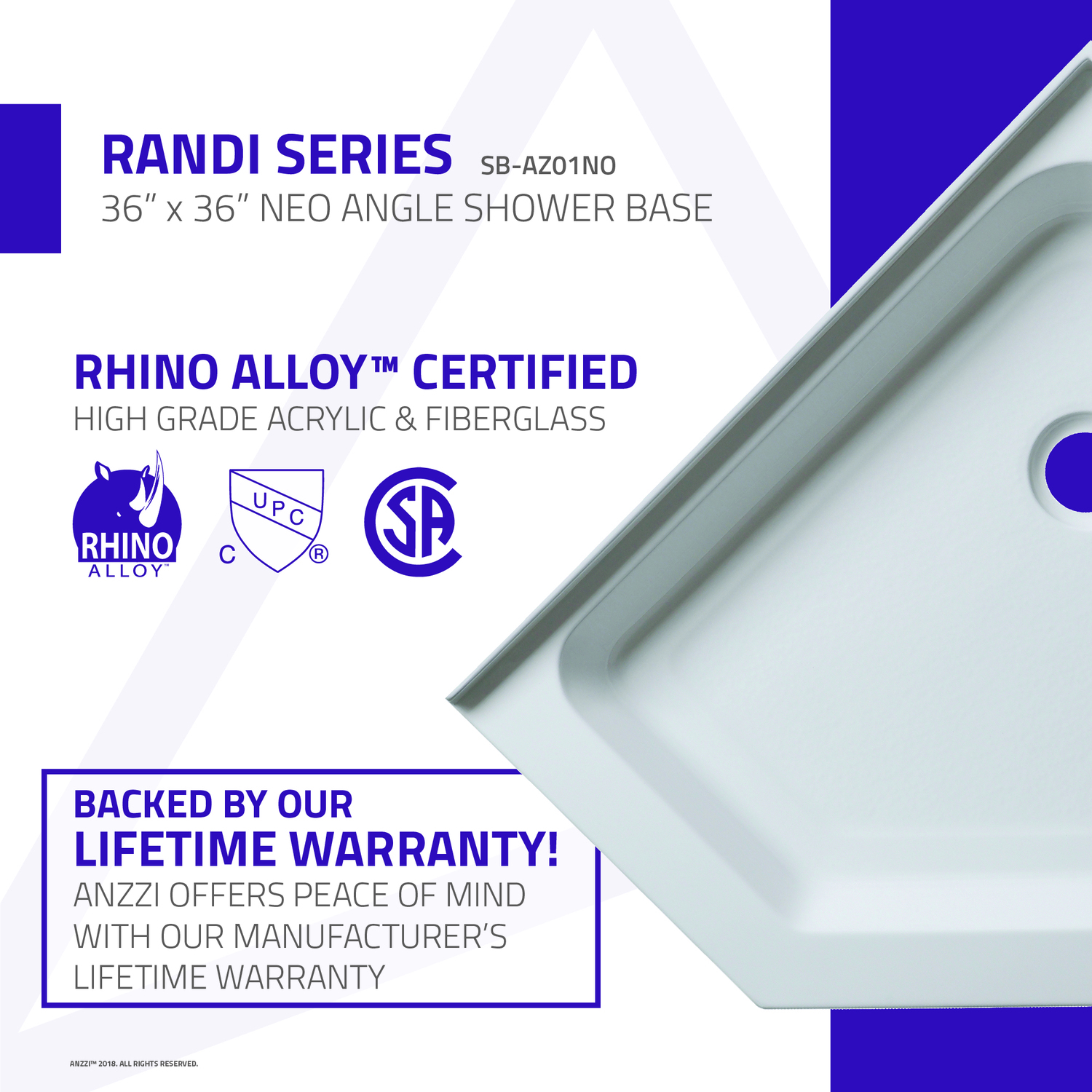 Durable, resilient, reliable — ANZZI has created the perfect foundation for your new dream shower! Our craftsmen use only Rhino Alloy-certified materials, like marine grade acrylic and high-yield fiberglass, to guarantee our shower bases meet the highest standards for quality. Then we add a glossy coated finish that’s guaranteed to catch the eye and complement the style of any bathroom.Lustrous high-gloss White finish enhances the appearance of any bathroomMade of durable Rhino Alloy-certified marine grade acrylic with fiberglass reinforcementCertified to meet all Uniform Plumbing Code (UPC) standardsDesigned with two (2) sided, 1.2 in. integrated tile flange for easy corner installationCenter drain location minimizes slope of surface for more secure footingDimensions: 36 in. W x 5.5 in. H x 36 in. DInterior depth of up to 2.5 in.Protected by our Limited lifetime warrantyGet it fast — ships from warehouse within 24 hours of order processingDrain assembly not includedTo speak to a knowledgeable ANZZI specialist, simply call 1-844-44-ANZZI or visit us on the web at www.ANZZI.com