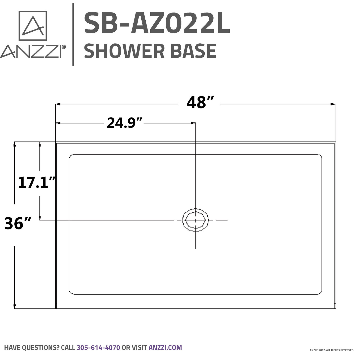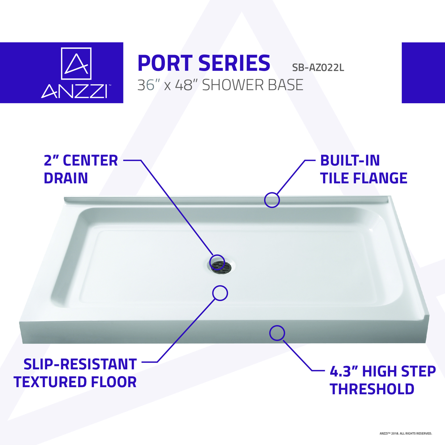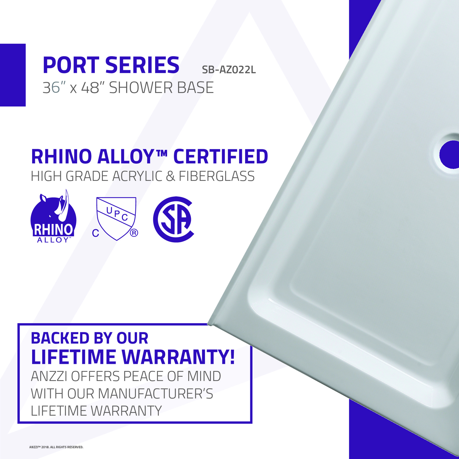 Trust ANZZI to provide the perfect foundation for your new dream shower. ANZZI shower bases are legendary for their durable resilience and high performance reliability. ANZZI craftsman use only RHINO ALLOY certified materials such as marine grade acrylic and high yield fiberglass to deliver a durable and stylish shower base unit. The glossy evenly coated finish is a striking eye catcher which compliments and enhances any style of bathroom.Overall dimensions: 48 in. W x 36 in. D x 5.5 in. HInterior depth of up to 2.5"esLustrous high gloss white finishRHINO ALLOY certified marine grade acrylic with fiberglass reinforcementcUPC certifiedIntegrated 1.2" tile flangeTwo (2) sided integrated tile flange for corner installationCenter drain locationDrain assembly not includedShips from warehouse within 24 hours of order processingLimited lifetime warrantyTo speak to a knowledgeable and dedicated ANZZI specialist simply call 1-844-44-ANZZI or visit us on the web at www.ANZZI.com
