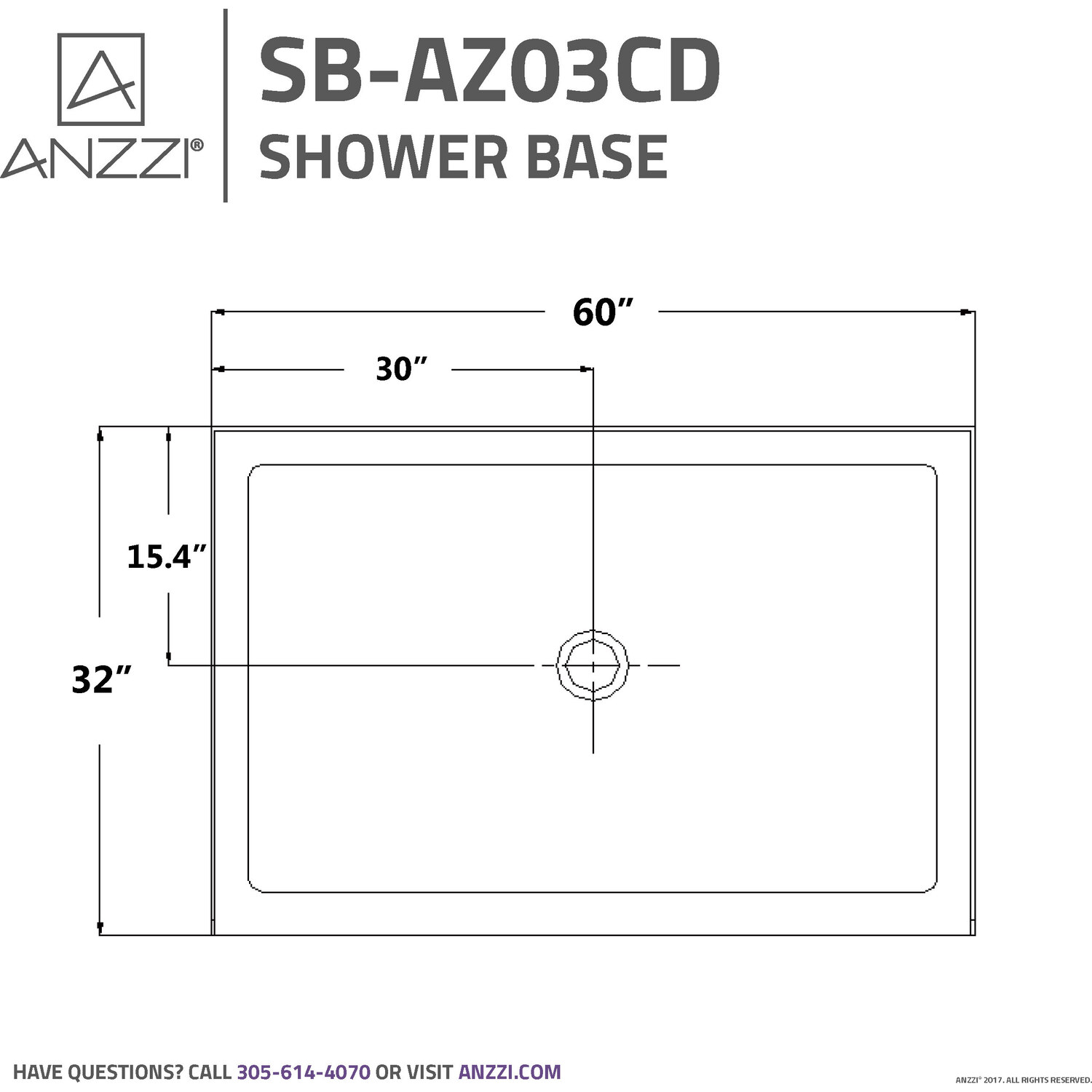 Trust ANZZI to provide the perfect foundation for your new dream shower. ANZZI shower bases are legendary for their durable resilience and high performance reliability. ANZZI craftsman use only RHINO ALLOY certified materials such as marine grade acrylic and high yield fiberglass to deliver a durable and stylish shower base unit. The glossy evenly coated finish is a striking eye catcher which compliments and enhances any style of bathroom.Overall dimensions: 60 in. W x 32 in. D x 5.5 in. HInterior depth of up to 2.5"esLustrous high gloss white finishRHINO ALLOY certified marine grade acrylic with fiberglass reinforcementcUPC certifiedIntegrated 1.2" tile flangeThree (3) sided integrated tile flange for 3-wall alcove installationCenter drain locationDrain assembly not includedShips from warehouse within 24 hours of order processingLimited lifetime warrantyTo speak to a knowledgeable and dedicated ANZZI specialist simply call 1-844-44-ANZZI or visit us on the web at www.ANZZI.com