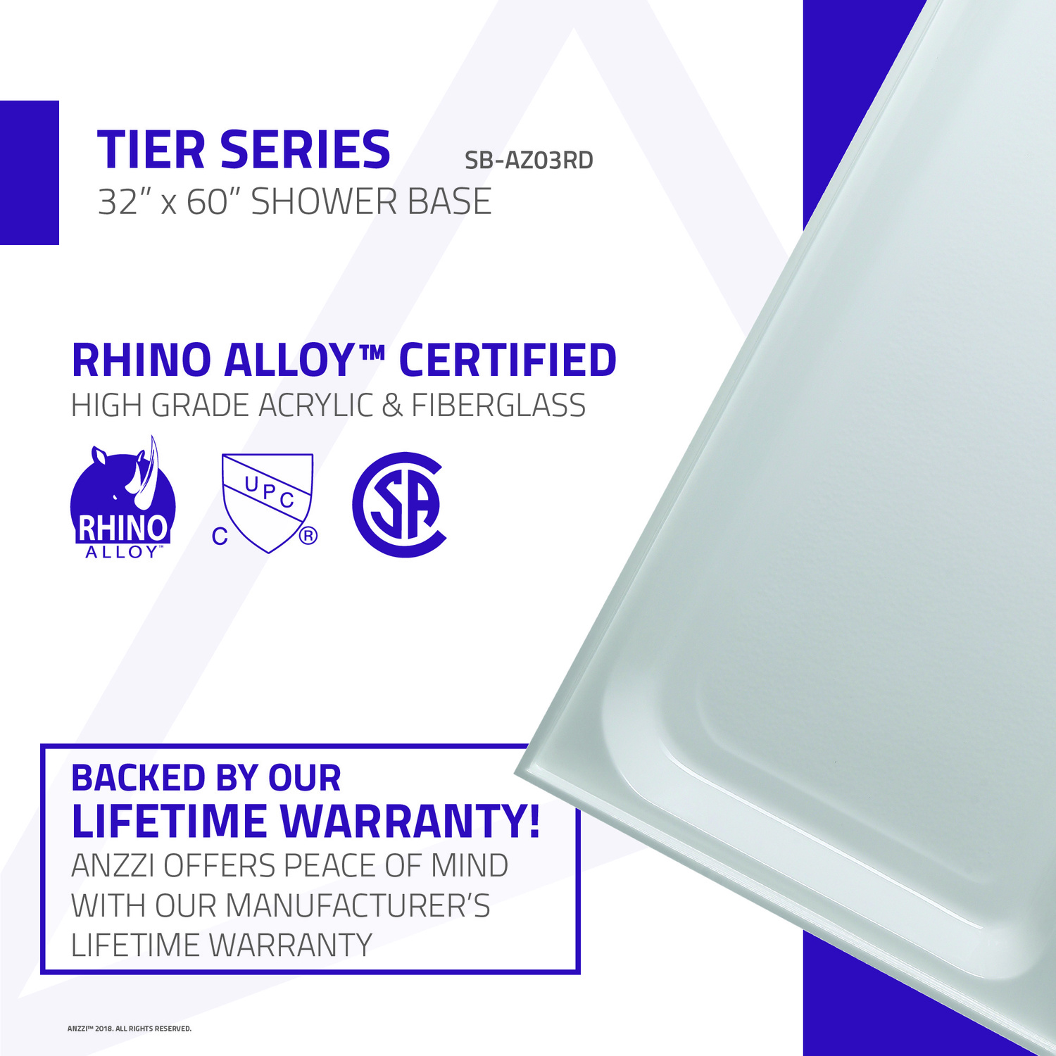 Trust ANZZI to provide the perfect foundation for your new dream shower. ANZZI shower bases are legendary for their durable resilience and high performance reliability. ANZZI craftsman use only RHINO ALLOY certified materials such as marine grade acrylic and high yield fiberglass to deliver a durable and stylish shower base unit. The glossy evenly coated finish is a striking eye catcher which compliments and enhances any style of bathroom.Overall dimensions: 60 in. W x 32 in. D x 5.5 in. HInterior depth of up to 2.5"esLustrous high gloss white finishRHINO ALLOY certified marine grade acrylic with fiberglass reinforcementcUPC certifiedIntegrated 1.2" tile flangeThree (3) sided integrated tile flange for 3-wall alcove installationRight drain locationDrain assembly not includedShips from warehouse within 24 hours of order processingLimited lifetime warrantyTo speak to a knowledgeable and dedicated ANZZI specialist simply call 1-844-44-ANZZI or visit us on the web at www.ANZZI.com