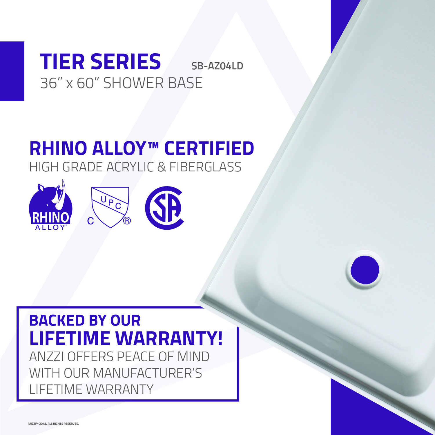 Trust ANZZI to provide the perfect foundation for your new dream shower. ANZZI shower bases are legendary for their durable resilience and high performance reliability. ANZZI craftsman use only RHINO ALLOY certified materials such as marine grade acrylic and high yield fiberglass to deliver a durable and stylish shower base unit. The glossy evenly coated finish is a striking eye catcher which compliments and enhances any style of bathroom.Overall dimensions: 60 in. W x 36 in. D x 5.5 in. HInterior depth of up to 2.5"esLustrous high gloss white finishRHINO ALLOY certified marine grade acrylic with fiberglass reinforcementcUPC certifiedIntegrated 1.2" tile flangeThree (3) sided integrated tile flange for 3-wall alcove installationLeft Drain locationDrain assembly not includedShips from warehouse within 24 hours of order processingLimited lifetime warrantyTo speak to a knowledgeable and dedicated ANZZI specialist simply call 1-844-44-ANZZI or visit us on the web at www.ANZZI.com