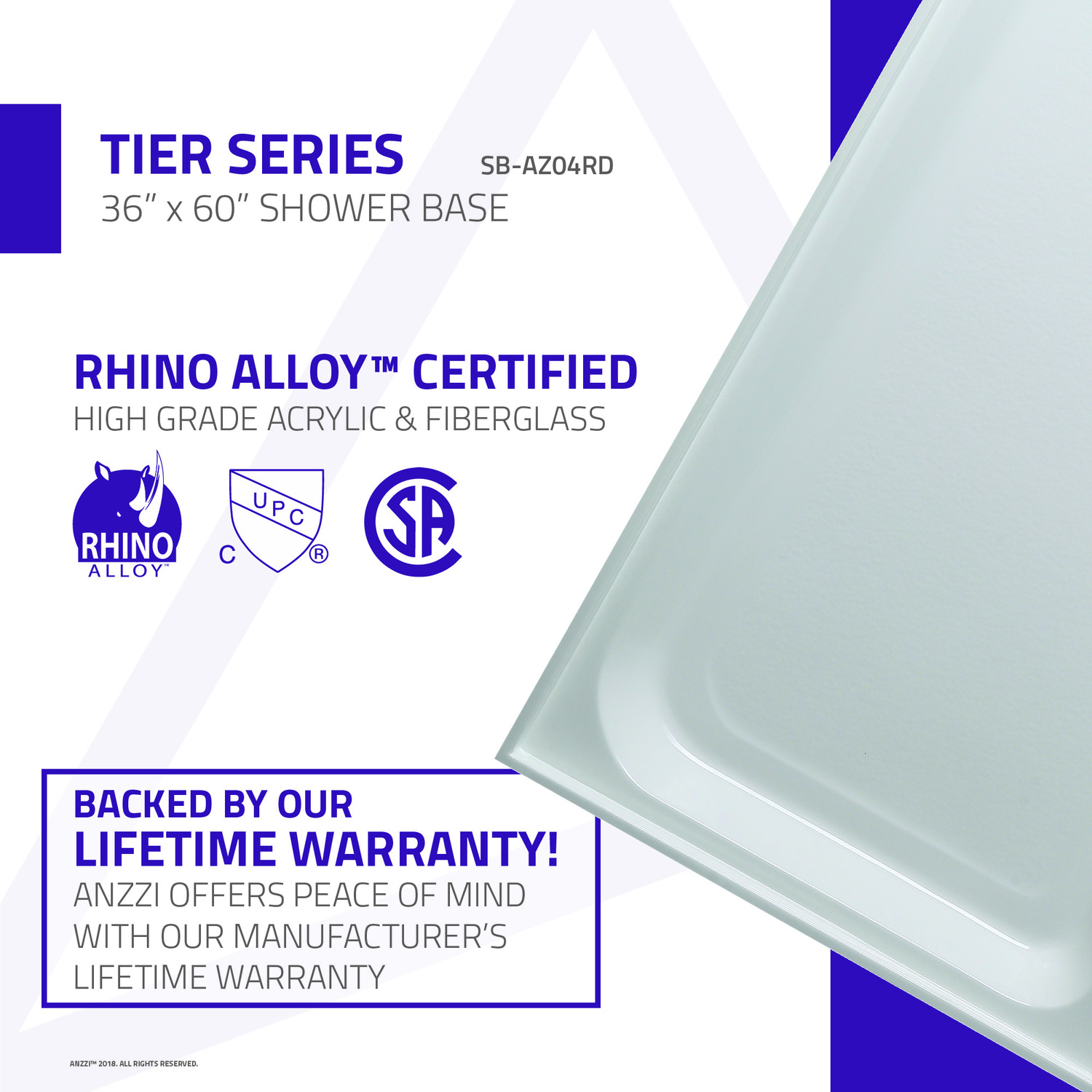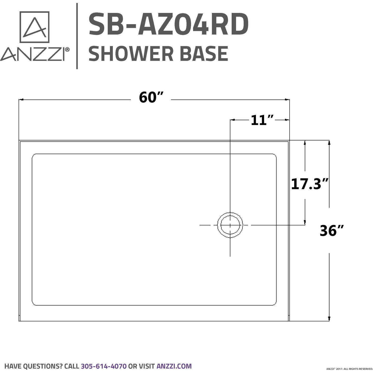 Trust ANZZI to provide the perfect foundation for your new dream shower. ANZZI shower bases are legendary for their durable resilience and high performance reliability. ANZZI craftsman use only RHINO ALLOY certified materials such as marine grade acrylic and high yield fiberglass to deliver a durable and stylish shower base unit. The glossy evenly coated finish is a striking eye catcher which compliments and enhances any style of bathroom.Overall dimensions: 60 in. W x 36 in. D x 5.5 in. HInterior depth of up to 2.5"esLustrous high gloss white finishRHINO ALLOY certified marine grade acrylic with fiberglass reinforcementcUPC certifiedIntegrated 1.2" tile flangeThree (3) sided integrated tile flange for 3-wall alcove installationRight drain locationDrain assembly not includedShips from warehouse within 24 hours of order processingLimited lifetime warrantyTo speak to a knowledgeable and dedicated ANZZI specialist simply call 1-844-44-ANZZI or visit us on the web at www.ANZZI.com