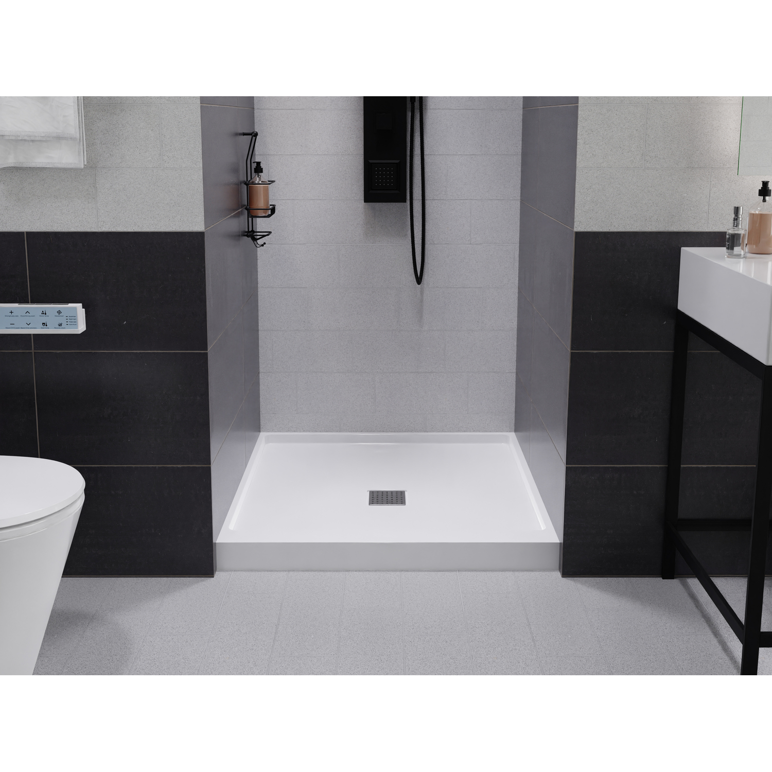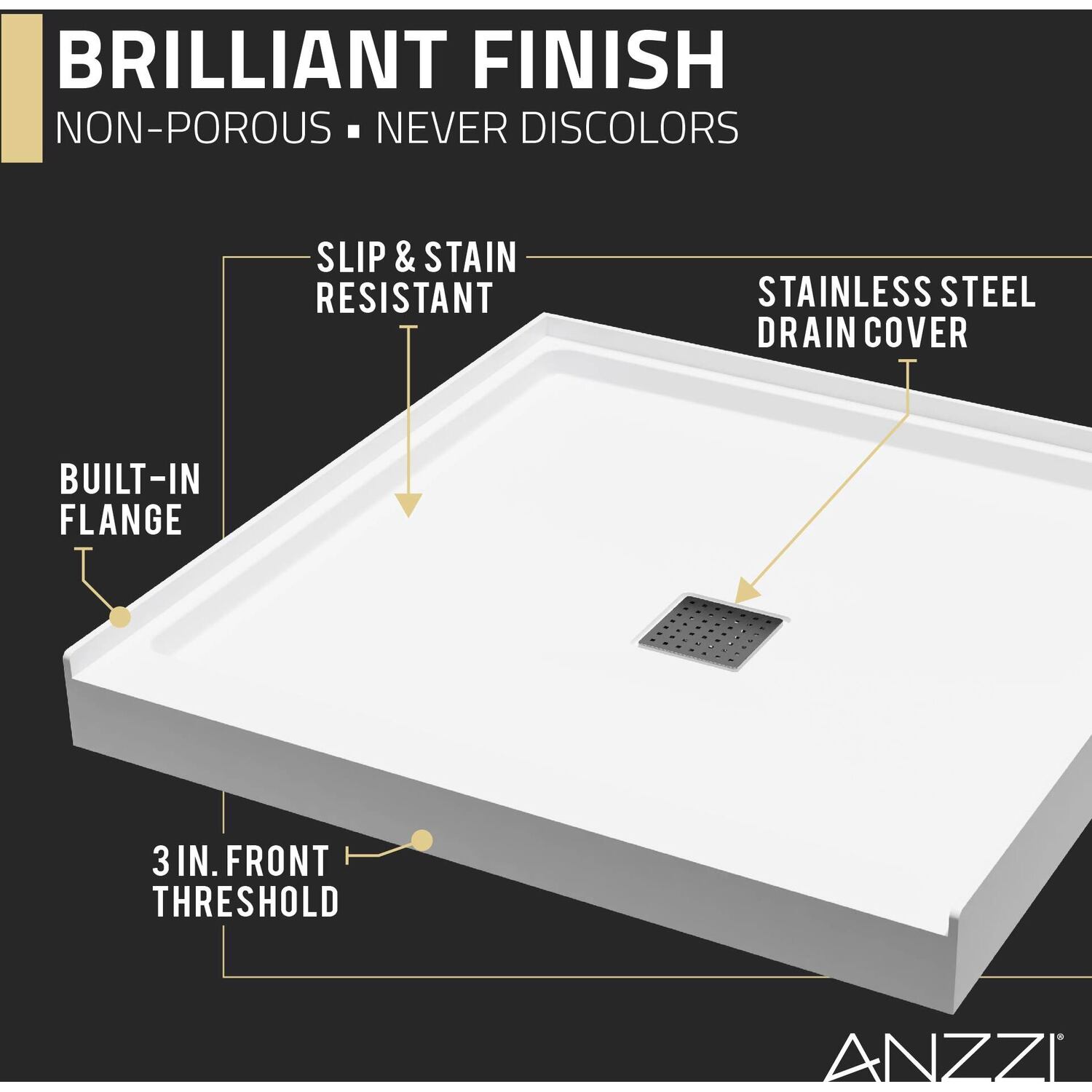 Like what you see? You can make this bathroom suite a reality with ANZZIALSO AVAILABLE FOR PURCHASE (Search #) : Shower Door (SD-AZ8075-02MB), Shower Panel (SP-AZ078MB), Smart Bidet (TL-STFF950WH), Console Sink (CS-FGC001-MB), Sink Faucet (L-AZ012MB), LED Mirror (BA-LMDFXBT005WH), Towel Warmer (TW-AZ018MBK)DIMENSIONS — 36 in. W x 36 in. D x 4 in. HCOMPRESSION MOLDED FROM SUPER-STRONG ANR MATERIAL — this durable material is a blend of resin, fiberglass and stone filler that’s stronger and lighter than both artificial stone and acrylicTWICE THE MATERIAL THICKNESS — no extra layers of reinforcement are needed!DURABLE & SOLID SURFACE CONSTRUCTION — ANR material will not crack, discolor or delaminateSUPERIOR TENSILE STRENGTH — ANR material is sturdy and won’t flex beneath your feet3X COMPRESSIVE STRENGTH — holds high levels of weight without sagging3X IMPACT RESISTANCE — stands up to years of rigorous useLOW THRESHOLD — designed to make stepping in and out effortlessSTAINLESS STEEL DRAIN COVER — stainless steel resists corrosion so cover always looks good and delivers a long lifetime of useSTURDY BOTTOM DESIGN — the solid surface grid base gives strong support and superior structural integrity; Easily handles over 700lbs of weightMOISTURE RESISTANT — protects against odor, mold and mildewLIMITED LIFETIME WARRANTY — when you buy it, we back it, so you can be confident in the quality of our products