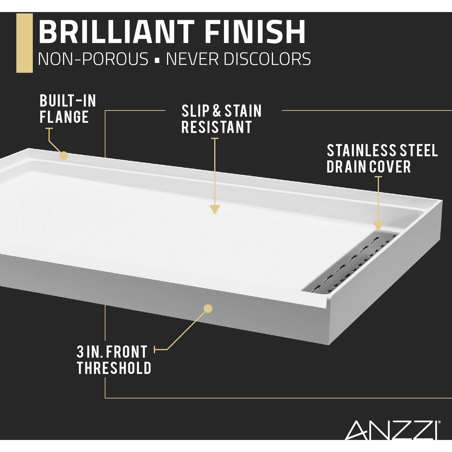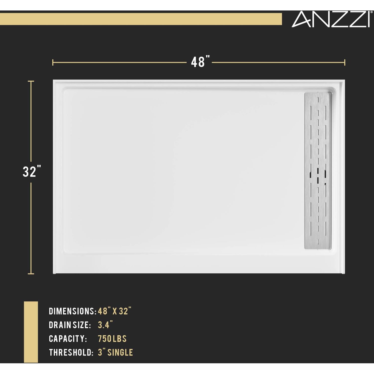 Like what you see? You can make this bathroom suite a reality with ANZZIALSO AVAILABLE FOR PURCHASE (Search #) : Shower Door (SD-AZ8077-02MB), Shower Panel (SP-AZ078MB), Smart Bidet (TL-STFF950WH), Console Sink (CS-FGC001-MB), Sink Faucet (L-AZ012MB), LED Mirror (BA-LMDFXBT005WH), Towel Warmer (TW-AZ026MBK)DIMENSIONS — 48 in. W x 32 in. D x 4 in. HCOMPRESSION MOLDED FROM SUPER-STRONG ANR MATERIAL — this super-durable material is a blend of resin, fiberglass and stone filler that’s stronger and lighter than both artificial stone and acrylicTWICE THE MATERIAL THICKNESS — no extra layers of reinforcement are needed!DURABLE & SOLID SURFACE CONSTRUCTION — ANR material will not crack, discolor or delaminateSUPERIOR TENSILE STRENGTH — ANR material is sturdy and won’t flex beneath your feet3X COMPRESSIVE STRENGTH — holds high levels of weight without sagging3X IMPACT RESISTANCE — stands up to years of rigorous useLOW THRESHOLD — designed to make stepping in and out effortlessSTAINLESS STEEL DRAIN COVER — stainless steel resists corrosion so cover always looks good and delivers a long lifetime of useSTURDY BOTTOM DESIGN — the solid surface grid base gives strong support and superior structural integrityMOISTURE RESISTANT — protects against odor, mold and mildewLIMITED LIFETIME WARRANTY — when you buy it, we back it, so you can be confident in the quality of our products