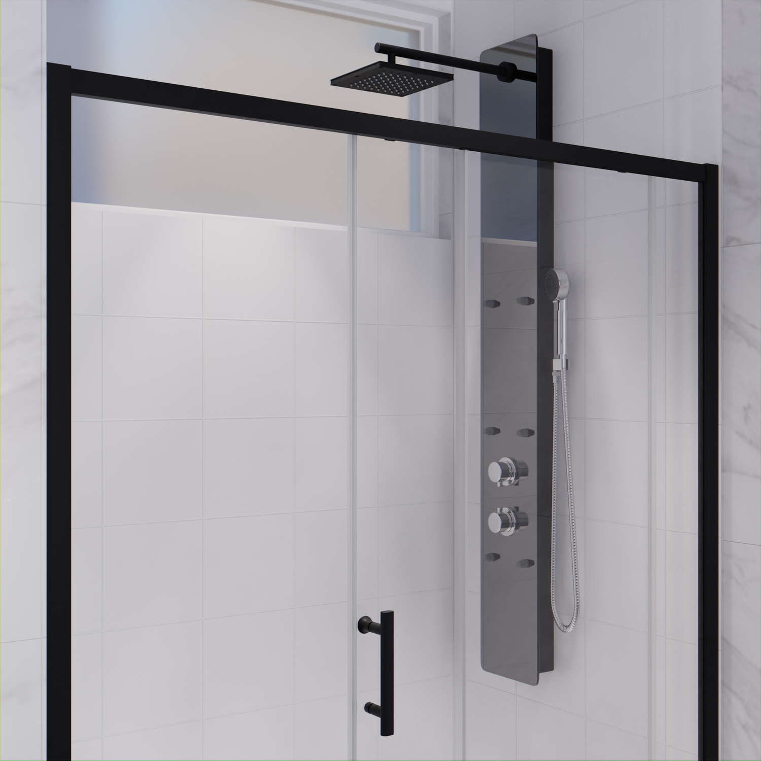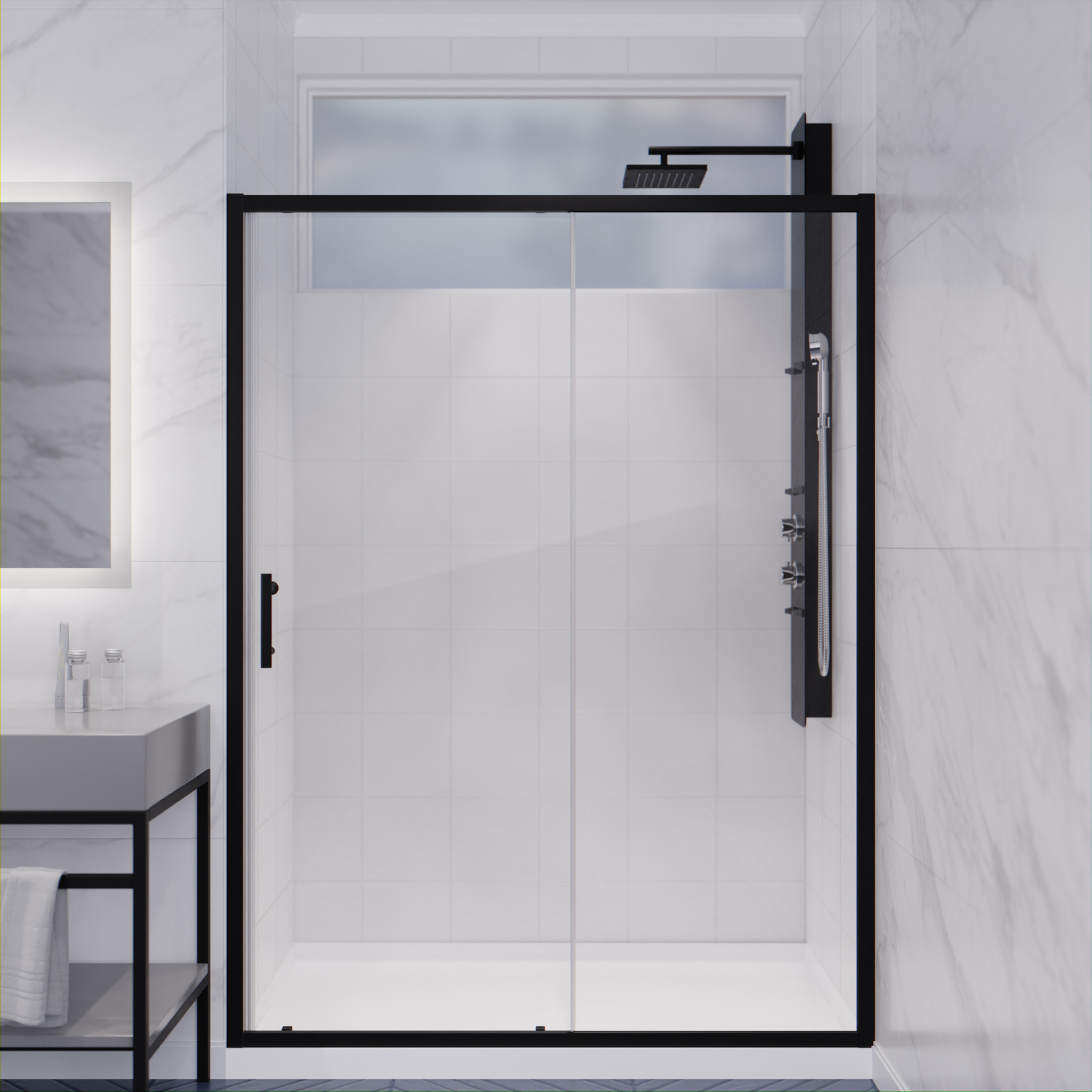 Like what you see? You can make this bathroom suite a reality with ANZZIALSO AVAILABLE FOR PURCHASE (Search #) : Vanity (CS-FGC002-MB), Bath Sink Faucet (L-AZ037MB), LED Mirror (BA-LMDFX004AL), Shower Panel (SP-AZ018), Towel Warmer (TW-AZ018MBK)RHINO ALLOY CERTIFIED - Every door is crafted using the highest grade ANSI certified tempered glass for safety and reliabilityEVERLASTING HARDWARE - Marine grade aluminum alloy frame and zinc hardware is highly rust resistant and will never tarnishSTUNNING FINISH - Striking and vibrant Matte Black hardware finish and pristine clear glassREVERSIBLE INSTALLATION - Opening can be installed on either left or right sideSCRATCH RESISTANT - Durable, scratch-resistant RHINO ALLOY Certified hardware protects against minor scratch and chipsSTYLISH FRAME - Eye catching Framed design provides sturdy support in an elegant styleEASY GLIDE ROLLERS - German engineered free floating rollers allow for an effortless door opening experienceMAGNETIC WATER SEAL - Magnetic watertight seal ensures water is kept inside the shower and off the bathroom floorOVERALL DIMENSIONS - 48 in. W x 72 in. HWALK THROUGH SIZE - 20.375 in. WDECO-GLASS - 1/4" (6mm) thick, crystal clear tempered deco-glass with pre-drilled hardware holesTSUNAMI GUARD - Dual sided protective glass coating prevent water stains, soap scum and limescale build up