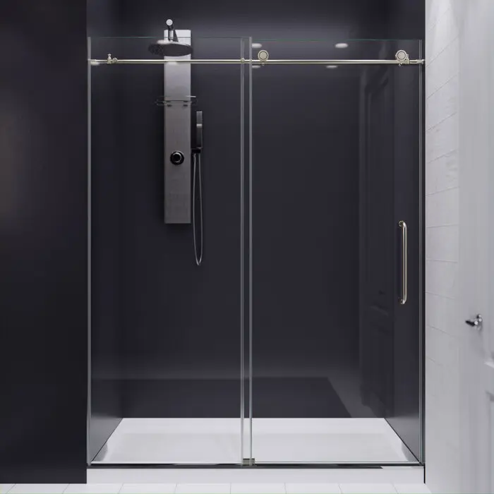 Like what you see? You can make this bathroom suite a reality with ANZZIALSO AVAILABLE FOR PURCHASE (Search #) : Towel Warmer (TW-AZ018BN), Console Sink (CS-FGC001-BN), Bathroom Faucet (L-AZ012BN), LED Mirror (BA-LMDFV002WH), Shower Panel (SP-AZ075)ANSI Certified 3/8 in. clear tempered Deco-Glass with TSUNAMI GUARD shieldingFrameless sliding design for minimalist styled nuanceDouble sided TSUNAMI GUARD repels water and moisture for pristine crystal clear glassOverall dimensions: 60 in. W x 76 in. HWalk in opening: 22 in. - 26 in. / Fixed panel size: 29.125 in.RHINO ALLOY certified Stainless Steel high forged rollers with free floating slide actionStunning and vibrant Brushed Nickel hardware finish and pristine clear glassRHINO ALLOY certified Stainless Steel door handle in Brushed NickelPackage includes: guide rail, door stopper, glass bracket, 2x high forged rollers, threshold and cover, stainless steel door handle, splash proof sealsClever symmetrical design allows for reversible left or right installationProfessional installation highly recommendedShips from warehouse within 24 hours of order processing
