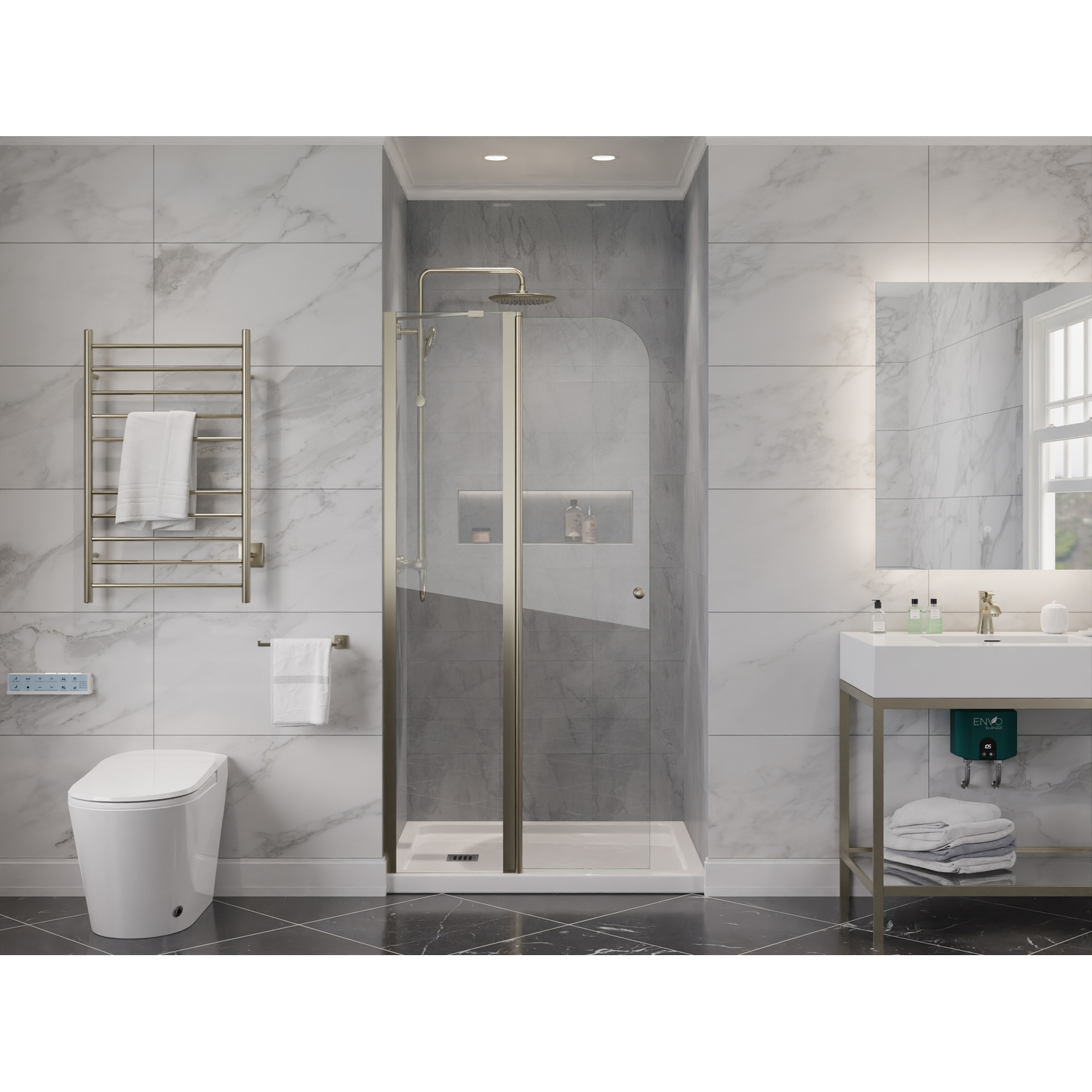 Like what you see? You can make this bathroom suite a reality with ANZZIALSO AVAILABLE FOR PURCHASE (Search #) : LED Mirror (BA-LMDFX006AL), Console Sink (CS-FGC001-BN), Sink Faucet (L-AZ012BN), Shower Head (SH-AZ101BN), Smart Bidet (TL-STFF950WH), Water Heater (WH-AZ035-M1), Towel Warmer (TW-WM104BN)SAFE, STRONG, DURABLE —tempered glass panels are ANSI-certifiedGLASS STAYS CRYSTAL CLEAR — Tsunami Guard shielding repels water to prevent cloudy build-upEASY GLIDE DOOR PIVOT — resistance-free for smooth and effortless opening/closingVERSATILE REVERSIBLE DESIGN — engineered for both right and left installation…whatever fits your space!RHINO ALLOY CERTIFIED — we use only the highest quality materials, guaranteed!FLAWLESS BRUSHED NICKEL FINISH — hardware never loses its luster and looks gorgeous year after yearDIMENSIONS — fixed panel: 72-in. H x 17.6-in. W, door: 72-in. H x 15.9-in. W, overall: 72-in. H x 33.5-in. WINCLUDES EVERYTHING YOU NEED — package includes screws, wall anchors, water sealing strip, pivot seat lubeLIMITED LIFETIME WARRANTY — when you buy it, we back it, so you can be confident in the quality of our productsGET IT FAST — ships from warehouse within 24 hours of order processingCURBSIDE DELIVERY — buying an ANZZI product is always easy and convenientProfessional installation highly recommended