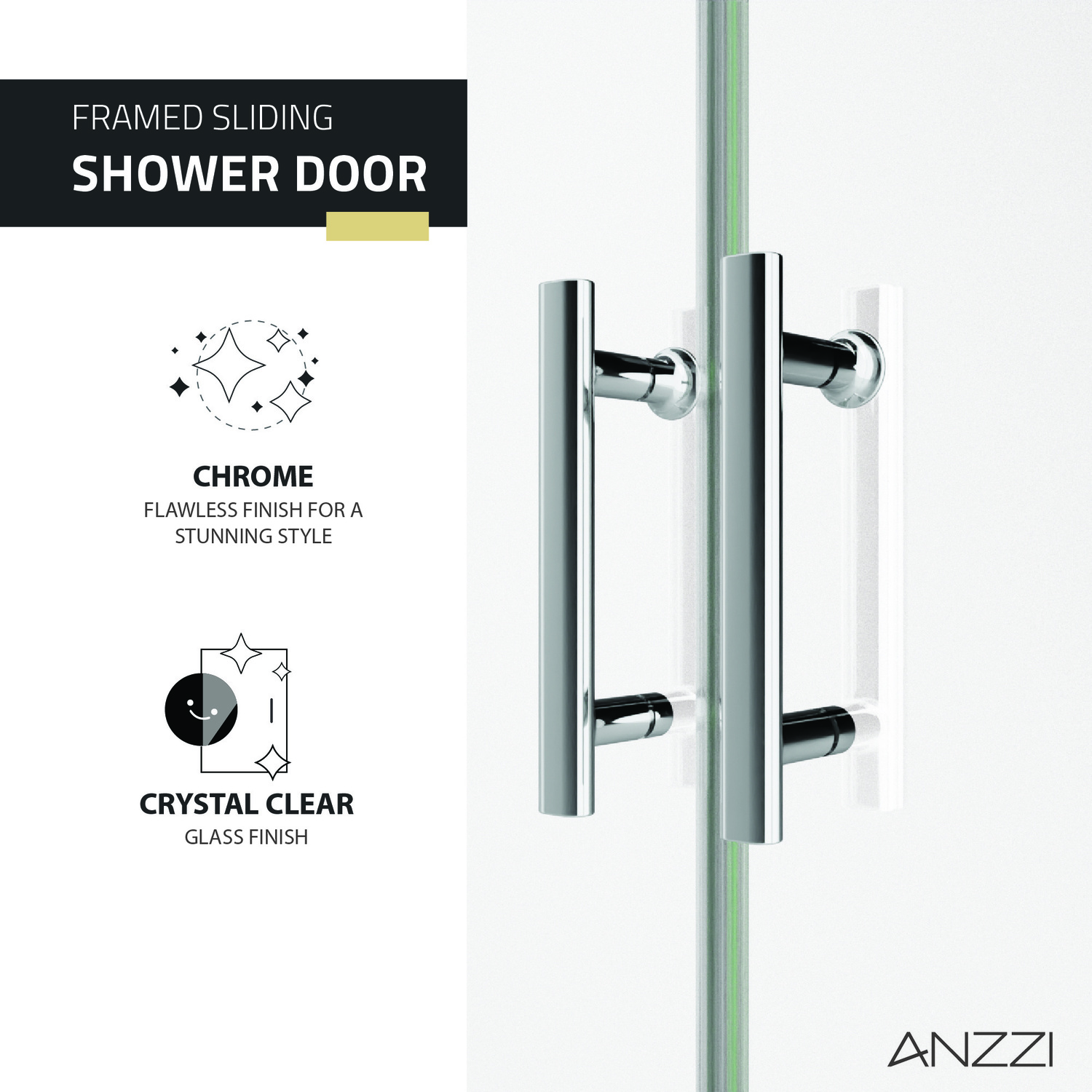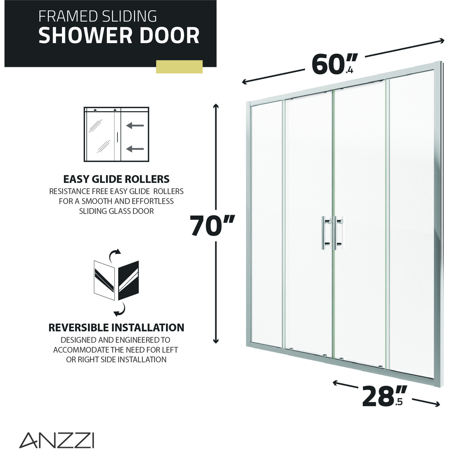 Sleek, subtle, yet stylish, ANZZI’s sliding shower door adds a welcome touch of elegance to any bathing space. The ultramodern good looks are matched to premium construction from top quality materials. ANSI-certified, tempered glass panels are strong, durable and safe. Tsunami Guard shielding repels water to prevent cloudy build-up. Easy glide rollers make opening and closing effortless. Aluminum hardware has a Chrome finish that won’t lose its luster and looks gorgeous year after year.Like what you see? You can make this bathroom suite a reality with ANZZIALSO AVAILABLE FOR PURCHASE (Search #) : LED Mirror (BA-LMDFX006AL), Console Sink (CS-FGC001-CH), Sink Faucet (L-AZ012), Shower Head (SH-AZ101CH), Smart Bidet (TL-STFF950WH), Water Heater (WH-AZ035-M1), Towel Warmer (TW-WM104CH)SAFE, STRONG, DURABLE —tempered glass panels are ANSI-certifiedGLASS STAYS CRYSTAL CLEAR — Tsunami Guard shielding repels water to prevent cloudy build-upEASY GLIDE ROLLERS — resistance-free for smooth and effortless opening/closingRHINO ALLOY™ CERTIFIED — we use only the highest quality materials, guaranteed!FLAWLESS CHROME FINISH — hardware never loses its luster and looks gorgeous year after yearDIMENSIONS — 70-in. H x 60.4-in. WINCLUDES EVERYTHING YOU NEED — package includes screws, wall anchors, water sealing strip, roller lubeLIMITED LIFETIME WARRANTY — when you buy it, we back it, so you can be confident in the quality of our productsGET IT FAST — ships from warehouse within 24 hours of order processingCURBSIDE DELIVERY — buying an ANZZI product is always easy and convenientProfessional installation highly recommendedAlso, in Brushed Gold #SD-AZ15-01BG, Brushed Nickel #SD-AZ15-01BN, Matte Black #SD-AZ15-01MB
