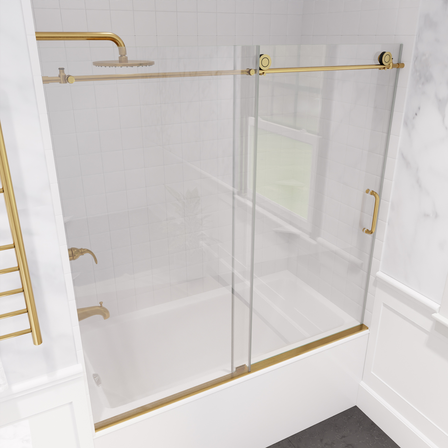 Like what you see? You can make this bathroom suite a reality with ANZZIALSO AVAILABLE FOR PURCHASE (Search #) : Shower Head (SH-AZ032BG), Bathtub (3060SHAL), Towel Warmer (TW-WM104BG), Smart Bidet (TL-STSF851WH), Vanity (V-CHG011-48), Sink Faucet (L-AZ018)ANSI Certified 3/8 in. clear tempered Deco-Glass with TSUNAMI GUARD shieldingFrameless sliding design for minimalist styled nuanceDouble sided TSUNAMI GUARD repels water and moisture for pristine crystal clear glassOverall dimensions: 60 in. W x 62 in. HDoor size: 32.5 in.RHINO ALLOY certified Stainless Steel high forged hinge hardware with 90 degree actionStriking and vibrant Brushed Gold hardware finish and pristine clear glassRHINO ALLOY certified Stainless Steel door handle in Brushed GoldPackage includes: guide rail, door stopper, glass bracket, roller guards, high forge rollers, handle, and waterproof sealsClever symmetrical design allows for reversible left or right installationProfessional installation highly recommendedShips from warehouse within 24 hours of order processing