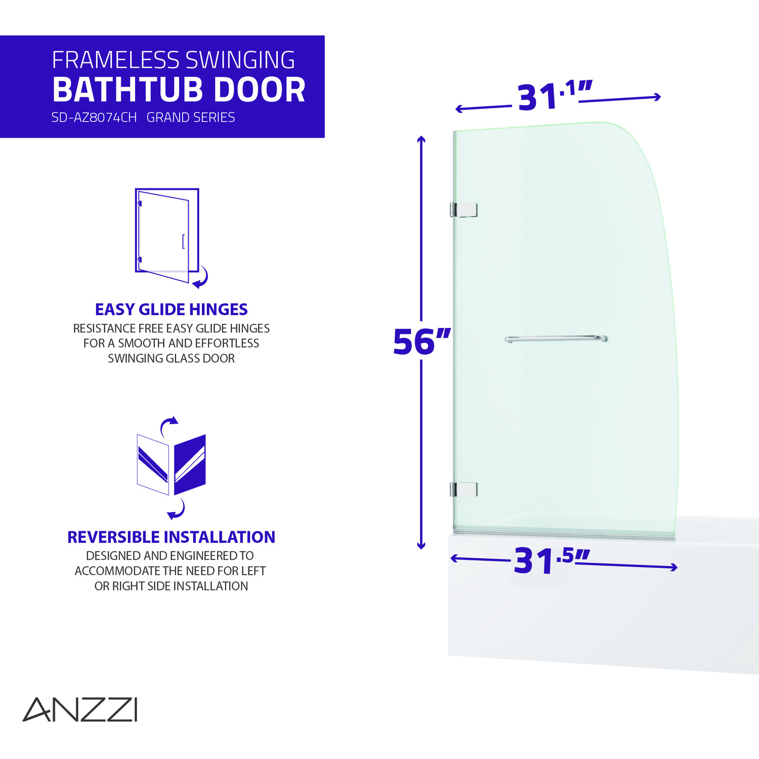 Like what you see? You can make this bathroom suite a reality with ANZZIALSO AVAILABLE FOR PURCHASE (Search #) : Bathtub (3260SHL), Shower Head (SH-AZ013), Towel Warmer (TW-AZ014CH), Vanity (CS-FGC005-CH), LED Mirror (BA-LMDFV002WH), Sink Faucet (L-AZ011), Smart Toilet (TL-STSF851WH)ANSI Certified 3/8 in. clear tempered Deco-Glass with TSUNAMI GUARD shieldingFrameless hinged design for minimalist styled nuanceDouble sided TSUNAMI GUARD repels water and moisture for pristine crystal clear glassOverall dimensions: 31.5 in. W x 56 H in.Door size: 31.5 in.RHINO ALLOY certified Stainless Steel high forged hardwareStriking and vibrant Polished Chrome hardware finish and pristine clear glassRHINO ALLOY certified Stainless Steel 23.5 in. mounted towel bar in Polished ChromePackage includes: 2x high forged hinge, 1x stainless steel Towel Bar, 1x tempered DECO-GLASS doorClever symmetrical design allows for reversible left or right installationProfessional installation highly recommendedShips from warehouse within 24 hours of order processing