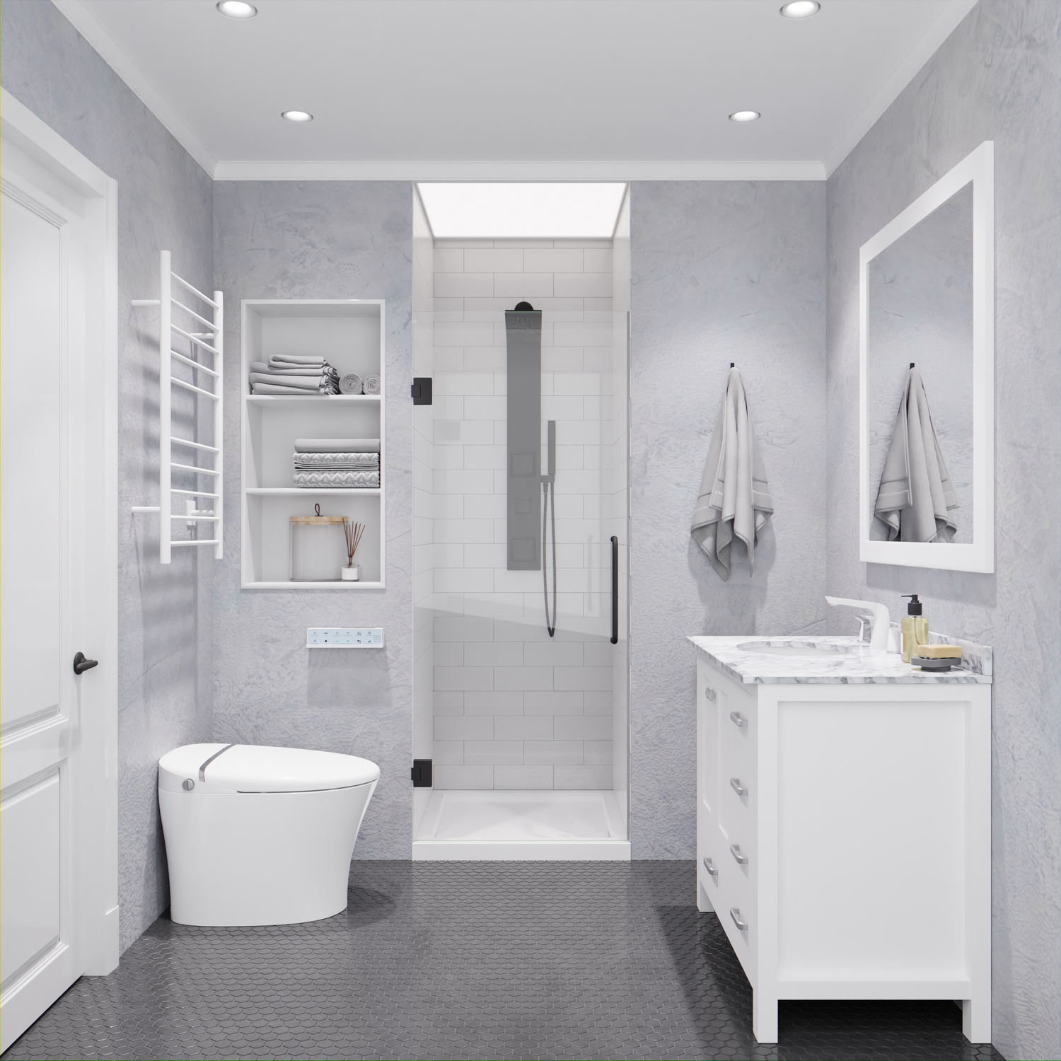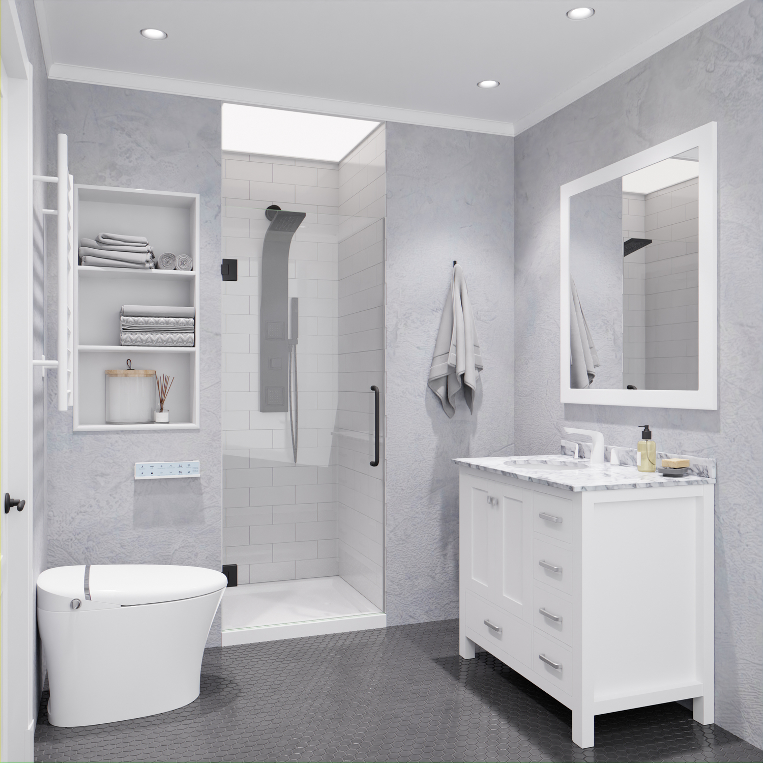 - ALSO AVAILABLE FOR PURCHASE (Search #) : Vanity (VT-MRCT0036-WH), Lav Faucet (L-AZ018), Shower Panel (SP-AZ078MB), Toilet (TL-STSF851W), Towel Warmer (TW-WM105WH)