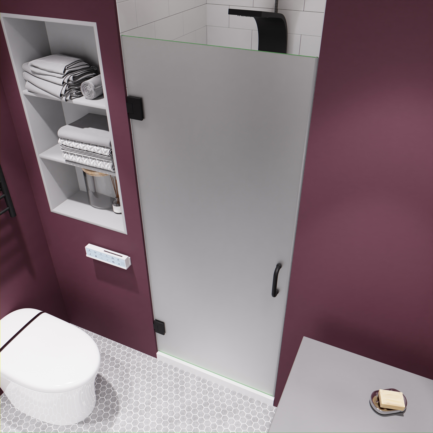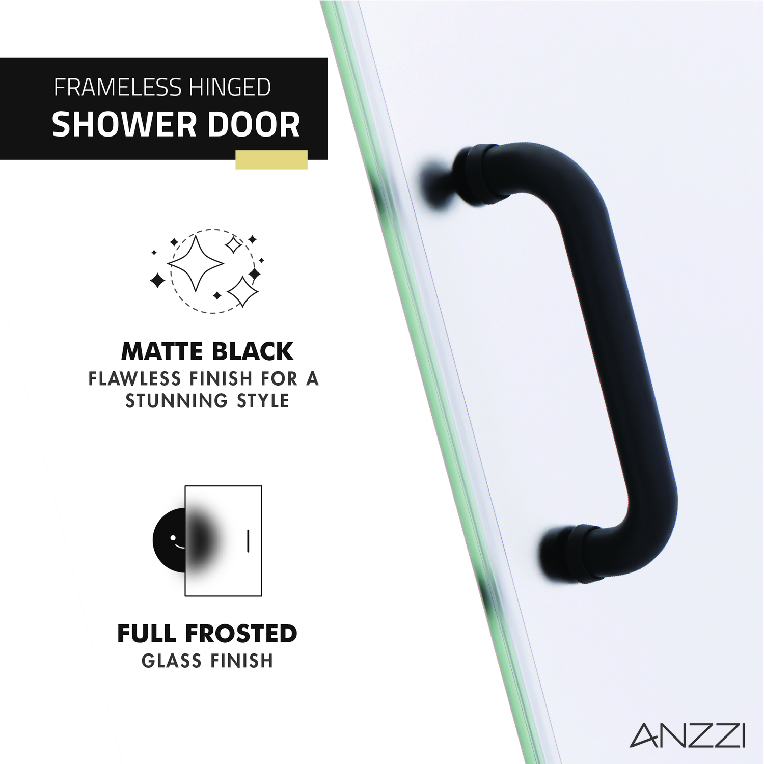 Like what you see? You can make this bathroom suite a reality with ANZZIALSO AVAILABLE FOR PURCHASE (Search #) : Vanity (CS-FGC002-MB), Lav Faucet (L-AZ037MB), Shower Panel (SP-AZ078MB), Toilet (TL-STSF851W), Towel Warmer (TW-WM105MB), LED Mirror (BA-LMDFX004AL)ANSI Certified 3/8 in. frosted tempered Deco-Glass with TSUNAMI GUARD shieldingFrameless swinging design for minimalist styled nuanceSingle sided TSUNAMI GUARD repels water and moisture preventing water stain build upOverall dimensions: 24 in. W x 72 H in.Walk in opening: 23 in.RHINO ALLOY certified Stainless Steel high forged hinge hardware with 90 degree actionStunning and vibrant Matte Black hardware finish and frosted glassRHINO ALLOY certified Stainless Steel door handle in Matte BlackPackage includes: 2x high forged hinge, 1x stainless steel door handle, 1x tempered DECO-GLASS doorClever symmetrical design allows for reversible left or right installationProfessional installation highly recommendedShips from warehouse within 24 hours of order processing
