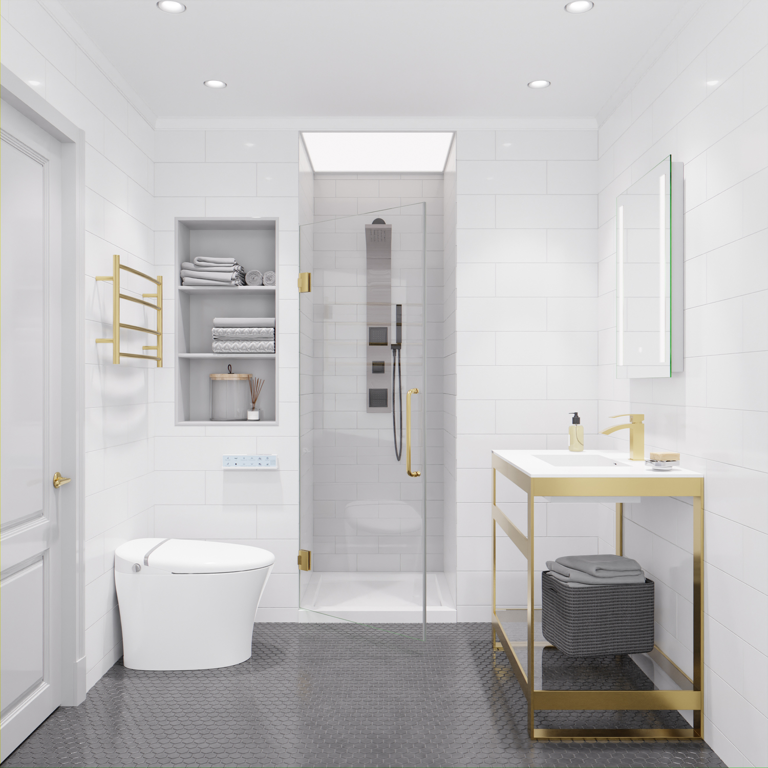 - ALSO AVAILABLE FOR PURCHASE (Search #) : Vanity (CS-FGC005-BG), Lav Faucet (L-AZ037BG), Shower Panel (SP-AZ078BS), Toilet (TL-STSF851W), Towel Warmer (TW-AZ018BG), LED Mirror (BA-LMDFV002WH)