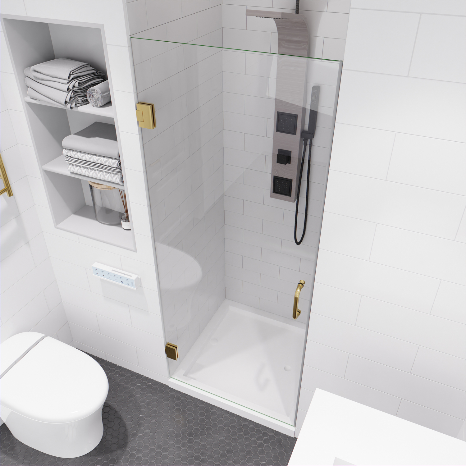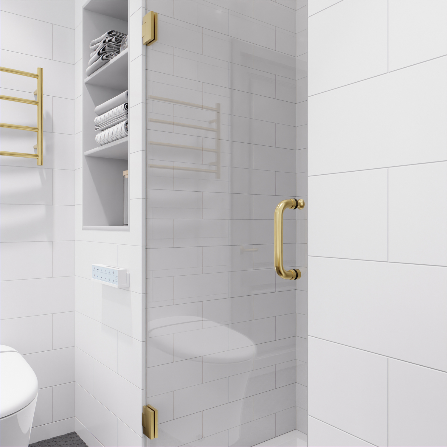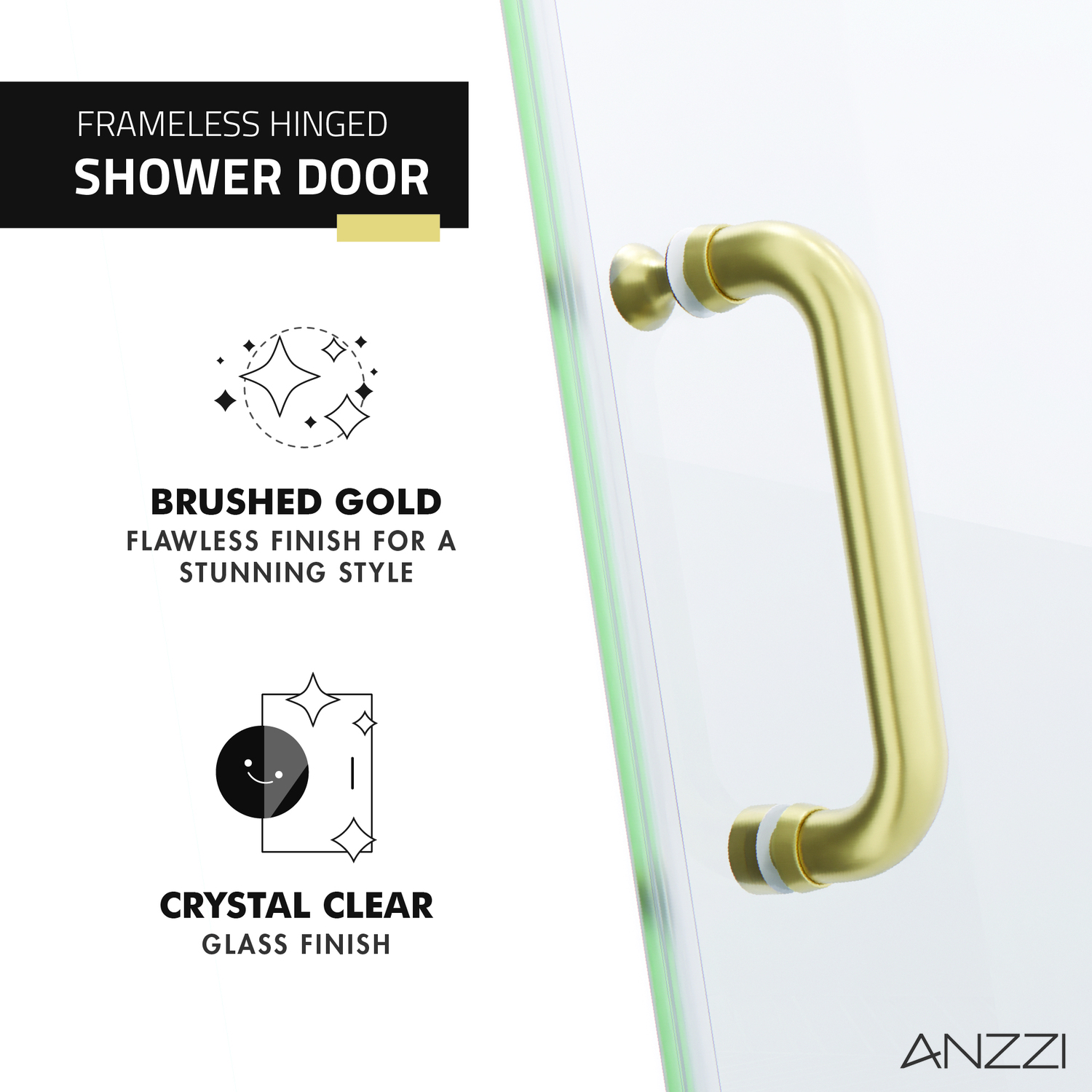 Like what you see? You can make this bathroom suite a reality with ANZZIALSO AVAILABLE FOR PURCHASE (Search #) : Vanity (CS-FGC005-BG), Lav Faucet (L-AZ037BG), Shower Panel (SP-AZ078BS), Toilet (TL-STSF851W), Towel Warmer (TW-AZ018BG), LED Mirror (BA-LMDFV002WH)ANSI Certified 3/8 in. clear tempered Deco-Glass with TSUNAMI GUARD shieldingFrameless swinging design for minimalist styled nuanceSingle sided TSUNAMI GUARD repels water and moisture for pristine crystal clear glassOverall dimensions: 30 in. W x 72 H in.Walk in opening: 30 in.RHINO ALLOY certified Stainless Steel high forged hinge hardware with 90 degree actionStunning and vibrant Brushed Gold hardware finish and pristine clear glassRHINO ALLOY certified Stainless Steel door handle in Brushed GoldPackage includes: 2x high forged hinge, 1x stainless steel door handle, 1x tempered DECO-GLASS doorClever symmetrical design allows for reversible left or right installationProfessional installation highly recommendedShips from warehouse within 24 hours of order processing