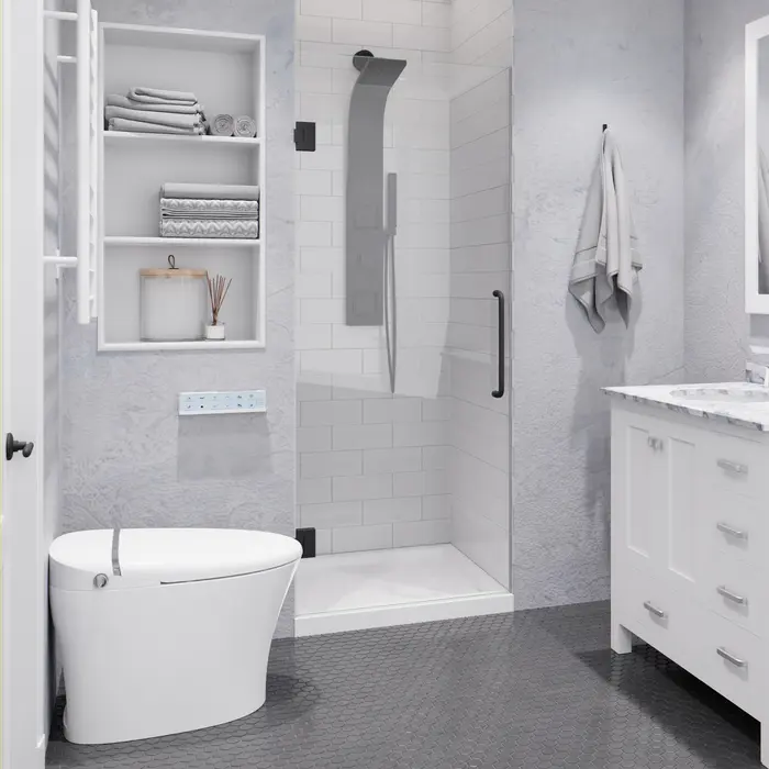- ALSO AVAILABLE FOR PURCHASE (Search #) : Vanity (VT-MRCT0036-WH), Lav Faucet (L-AZ018), Shower Panel (SP-AZ078MB), Toilet (TL-STSF851W), Towel Warmer (TW-WM105WH)