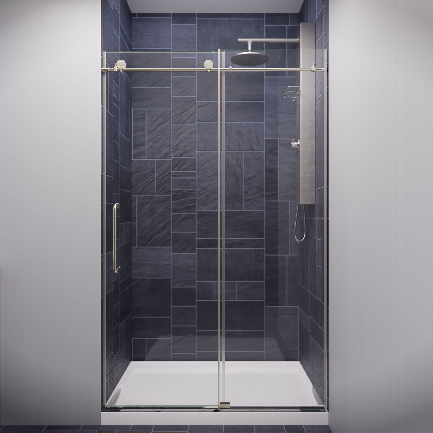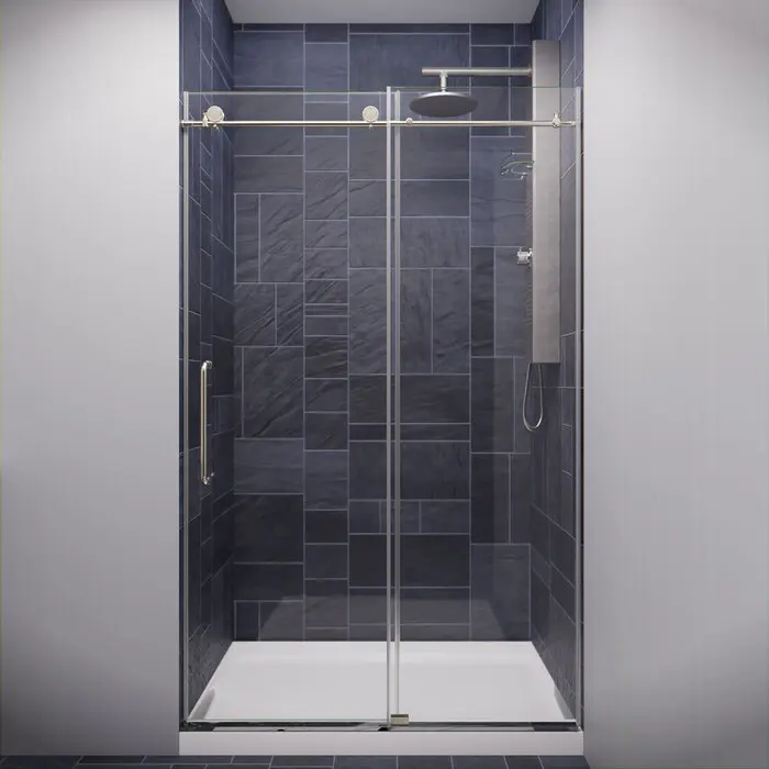 Like what you see? You can make this bathroom suite a reality with ANZZIALSO AVAILABLE FOR PURCHASE (Search #) : Towel Warmer (TW-AZ018BN), Console Sink (CS-FGC005-BN), Bathroom Faucet (L-AZ011BN), LED Mirror (BA-LMDFXBT005WH), Shower Panel (SP-AZ075)ANSI Certified 3/8 in. clear tempered Deco-Glass with TSUNAMI GUARD shieldingFrameless sliding design for minimalist styled nuanceDouble sided TSUNAMI GUARD repels water and moisture for pristine crystal clear glassOverall dimensions: 48 in. W x 76 H in.Walk in opening: 16 in. - 20 in. / Fixed panel size: 23.125 in.RHINO ALLOY certified Stainless Steel high forged rollers with free floating slide actionStunning and vibrant Brushed Nickel hardware finish and pristine clear glassRHINO ALLOY certified Stainless Steel door handle in Brushed NickelPackage includes: guide rail, door stopper, glass bracket, 2x high forged rollers, threshold and cover, stainless steel door handle, splash proof sealsClever symmetrical design allows for reversible left or right installationProfessional installation highly recommendedShips from warehouse within 24 hours of order processing