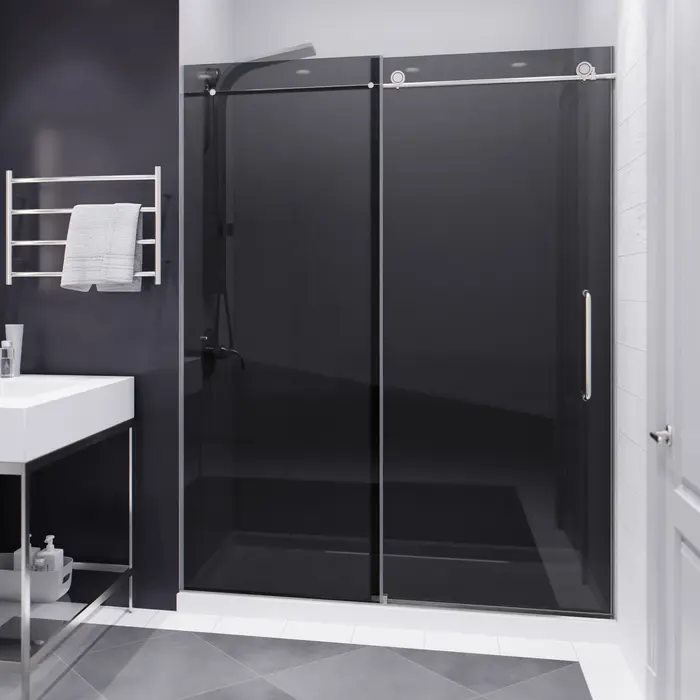 Like what you see? You can make this bathroom suite a reality with ANZZIALSO AVAILABLE FOR PURCHASE (Search #) : Vanity (CS-FGC001-BN), Lav Faucet (L-AZ011BN), Shower Panel (SP-AZ078BS), Towel Warmer (TW-AZ018BN), LED Mirror (BA-LMDFV002WH)ANSI Certified 3/8 in. tinted tempered Deco-Glass with TSUNAMI GUARD shieldingFrameless sliding design for minimalist styled nuanceSingle sided TSUNAMI GUARD repels water and moisture preventing water stain build upOverall dimensions: 60 in. W x 76 in. HWalk in opening: 22 in. - 26 in. / Fixed panel size: 29.125 in.RHINO ALLOY certified Stainless Steel high forged rollers with free floating slide actionStunning and vibrant Brushed Nickel hardware finish and pristine black glassRHINO ALLOY certified Stainless Steel door handle in Brushed NickelPackage includes: guide rail, door stopper, glass bracket, 2x high forged rollers, threshold and cover, stainless steel door handle, splash proof sealsClever symmetrical design allows for reversible left or right installationProfessional installation highly recommendedShips from warehouse within 24 hours of order processing