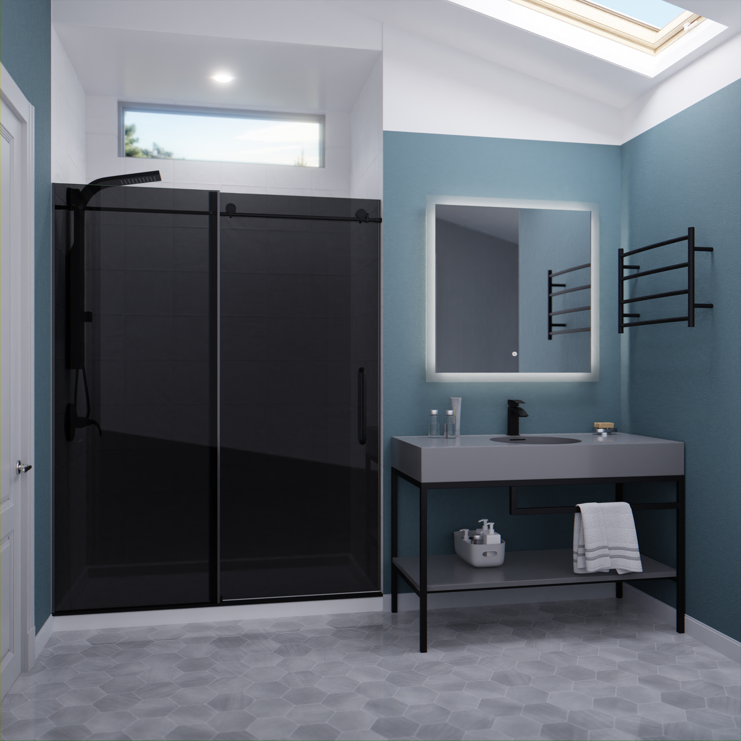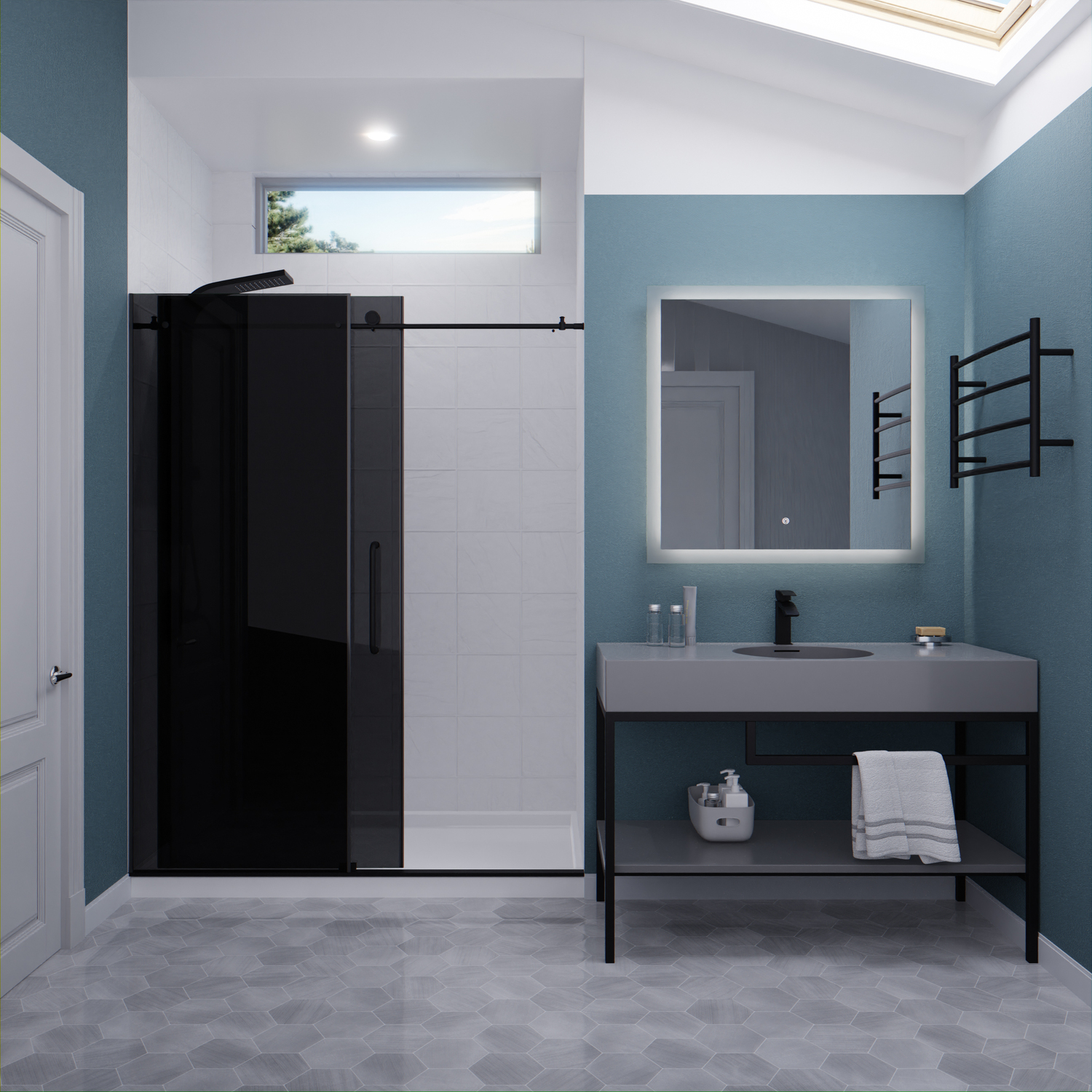 Like what you see? You can make this bathroom suite a reality with ANZZIALSO AVAILABLE FOR PURCHASE (Search #) : Vanity (CS-FGC002-MB), Lav Faucet (L-AZ037MB), Shower Panel (SP-AZ078MB), Towel Warmer (TW-AZ018MBK), LED Mirror (BA-LMDFX004AL)ANSI Certified 3/8 in. tinted tempered Deco-Glass with TSUNAMI GUARD shieldingFrameless sliding design for minimalist styled nuanceSingle sided TSUNAMI GUARD repels water and moisture preventing water stain build upOverall dimensions: 60 in. W x 76 in. HWalk in opening: 22 in. - 26 in. / Fixed panel size: 29.125 in.RHINO ALLOY certified Stainless Steel high forged rollers with free floating slide actionStunning and vibrant Matte Black hardware finish and pristine black glassRHINO ALLOY certified Stainless Steel door handle in Matte BlackPackage includes: guide rail, door stopper, glass bracket, 2x high forged rollers, threshold and cover, stainless steel door handle, splash proof sealsClever symmetrical design allows for reversible left or right installationProfessional installation highly recommendedShips from warehouse within 24 hours of order processing