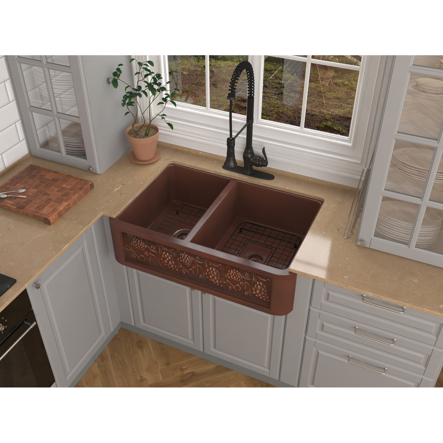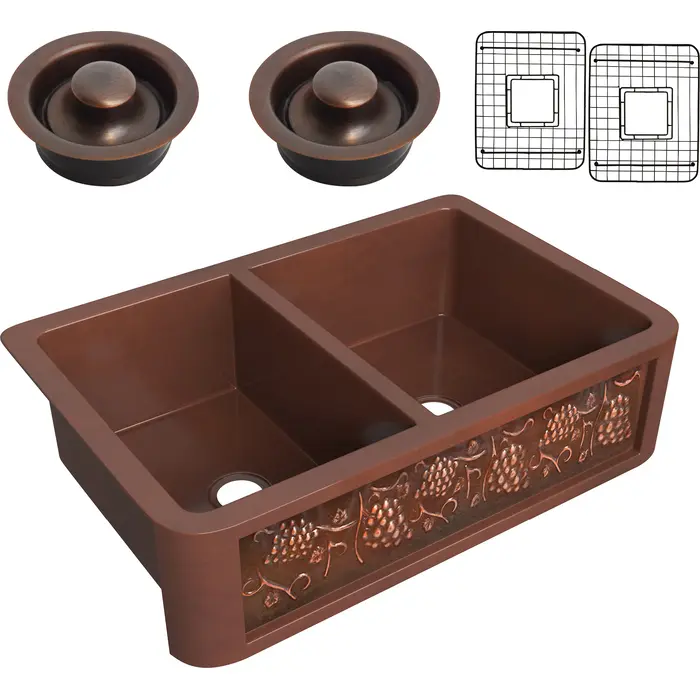 Anzzi Dalmatia Farmhouse Handmade Copper 33 in. 40/60 Double Bowl Kitchen Sink with Grape Vine Design in Polished Antique Copper, 191042047112, SK-007