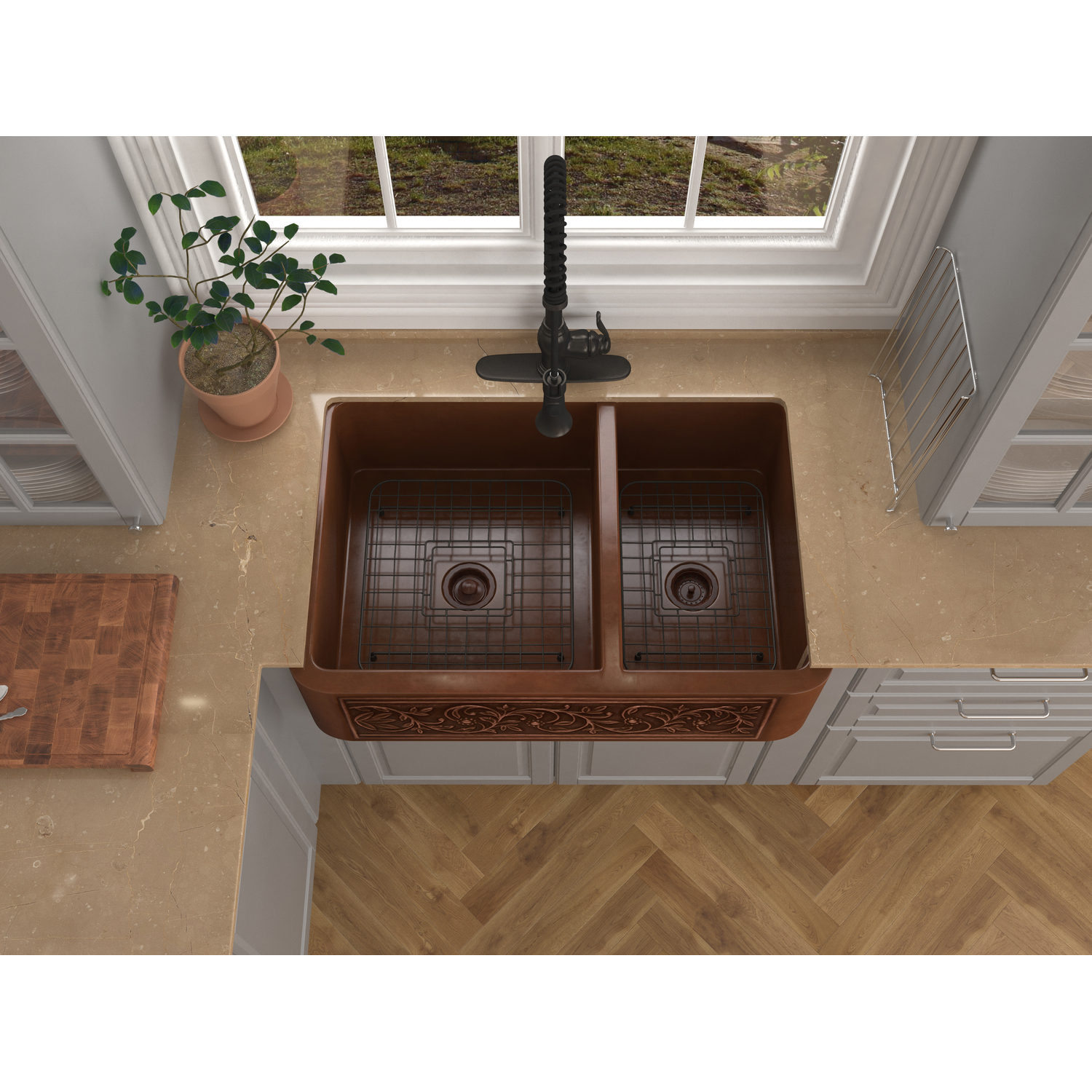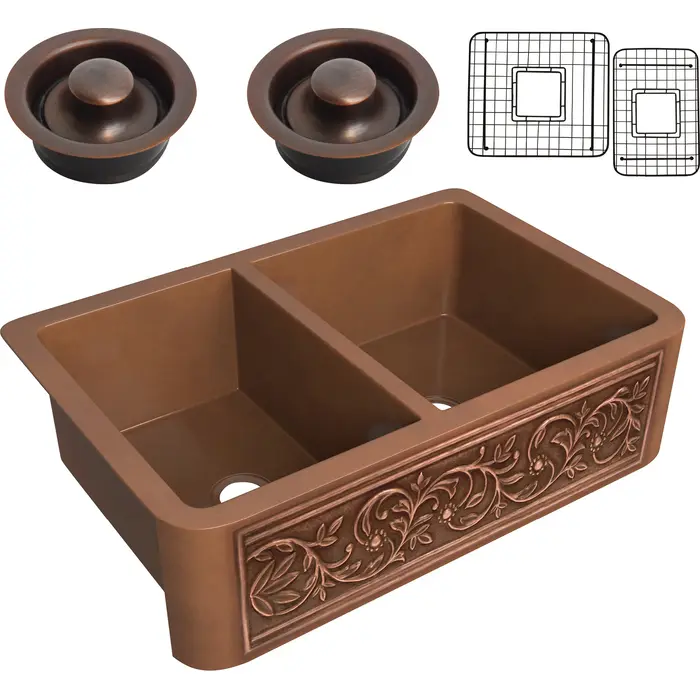 Anzzi Moesia Farmhouse Handmade Copper 33 in. 60/40 Double Bowl Kitchen Sink with Floral Design in Polished Antique Copper, 191042047143, SK-010