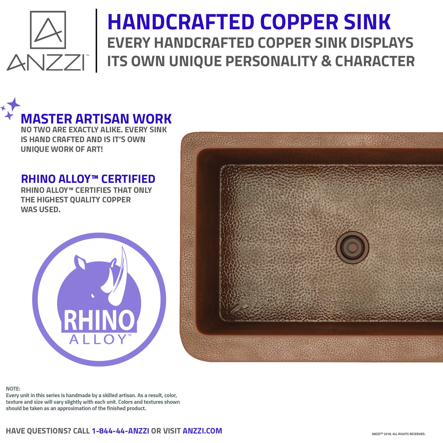 ANZZI presents the latest trending in modern antique Miletus series farmhouse kitchen sink. All ANZZI Miletus kitchen sinks are handcrafted using only Rhino Alloy certified artisan copper. This gorgeous farmhouse sink will transform your kitchen into an expression of yourself on par with the finest of culinary arts. Become a member of the ANZZI family and experience why Perfection is our Tradition.Single bowl kitchen sinkShips within 24 hours of order processingEvery piece is fully handmade from start to finishCrafted using RHINO ALLOY certified copperLimited lifetime warranty from manufacturer defectsHandmade process will result in subtle variations in color, shape and finishMatching stopper and basin grid includedOne piece constructionTo speak to a knowledgeable and dedicated ANZZI specialist simply call 1-844-44-ANZZI or visit us on the web at www.ANZZI.com